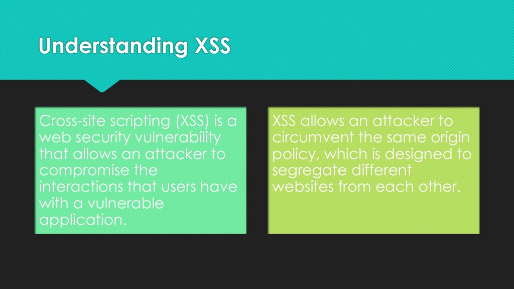 that allows an attacker to compromise the interactions that users have with a vulnerable application. XSS allows an attacker to circumvent the same origin policy, which is designed to segregate different websites from each other.