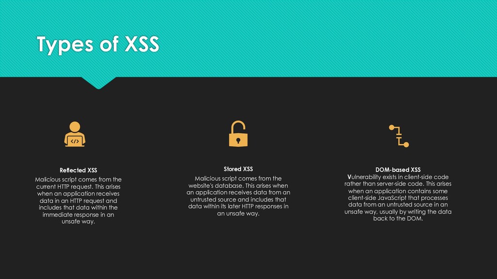 current HTTP request. This arises when an application receives data in an HTTP request and includes that data within the immediate response in an unsafe way. Stored XSS Malicious script comes from the website's database. This arises when an application receives data from an untrusted source and includes that data within its later HTTP responses in an unsafe way. DOM-based XSS Vulnerability exists in client-side code rather than server-side code. This arises when an application contains some client-side JavaScript that processes data from an untrusted source in an unsafe way, usually by writing the data back to the DOM.
