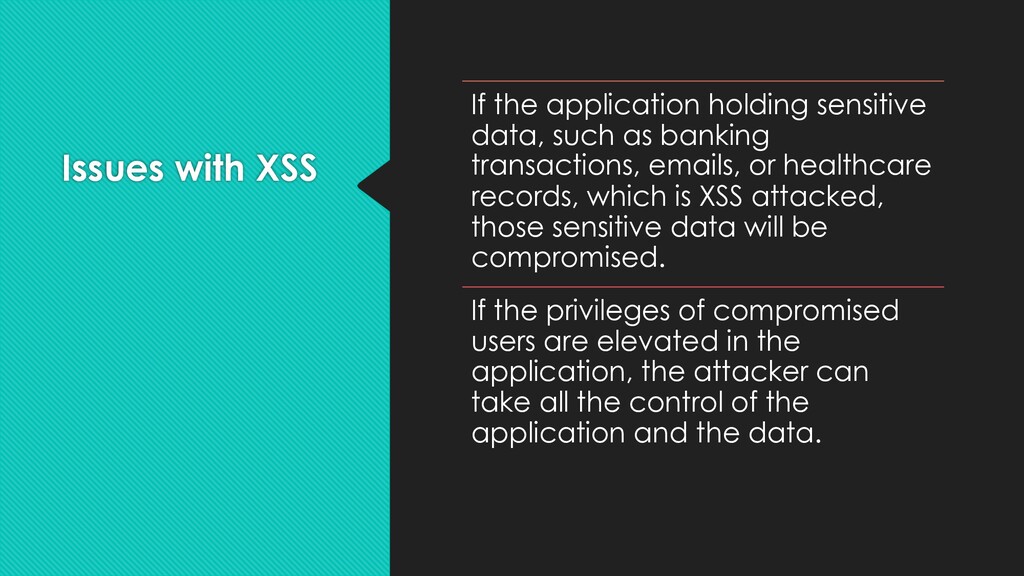 as banking transactions, emails, or healthcare records, which is XSS attacked, those sensitive data will be compromised. If the privileges of compromised users are elevated in the application, the attacker can take all the control of the application and the data.