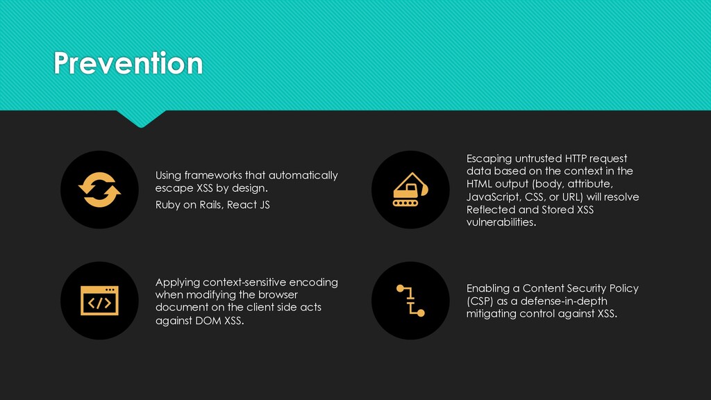on Rails, React JS Escaping untrusted HTTP request data based on the context in the HTML output (body, attribute, JavaScript, CSS, or URL) will resolve Reflected and Stored XSS vulnerabilities. Applying context-sensitive encoding when modifying the browser document on the client side acts against DOM XSS. Enabling a Content Security Policy (CSP) as a defense-in-depth mitigating control against XSS.