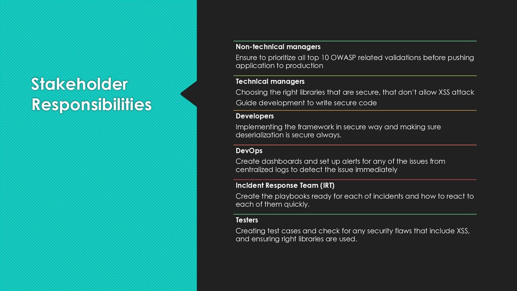 OWASP related validations before pushing application to production Technical managers Choosing the right libraries that are secure, that don’t allow XSS attack Guide development to write secure code Developers Implementing the framework in secure way and making sure deserialization is secure always. DevOps Create dashboards and set up alerts for any of the issues from centralized logs to detect the issue immediately Testers Creating test cases and check for any security flaws that include XSS, and ensuring right libraries are used. Incident Response Team (IRT) Create the playbooks ready for each of incidents and how to react to each of them quickly.