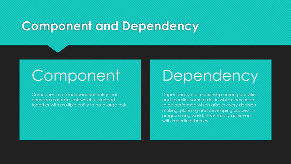 some atomic task which is clubbed together with multiple entity to do a large task. Component Dependency is a relationship among activities and specifies some order in which they need to be performed which arise in every decision making, planning and developing process. In programming world, this is mostly achieved with importing libraries. Dependency
