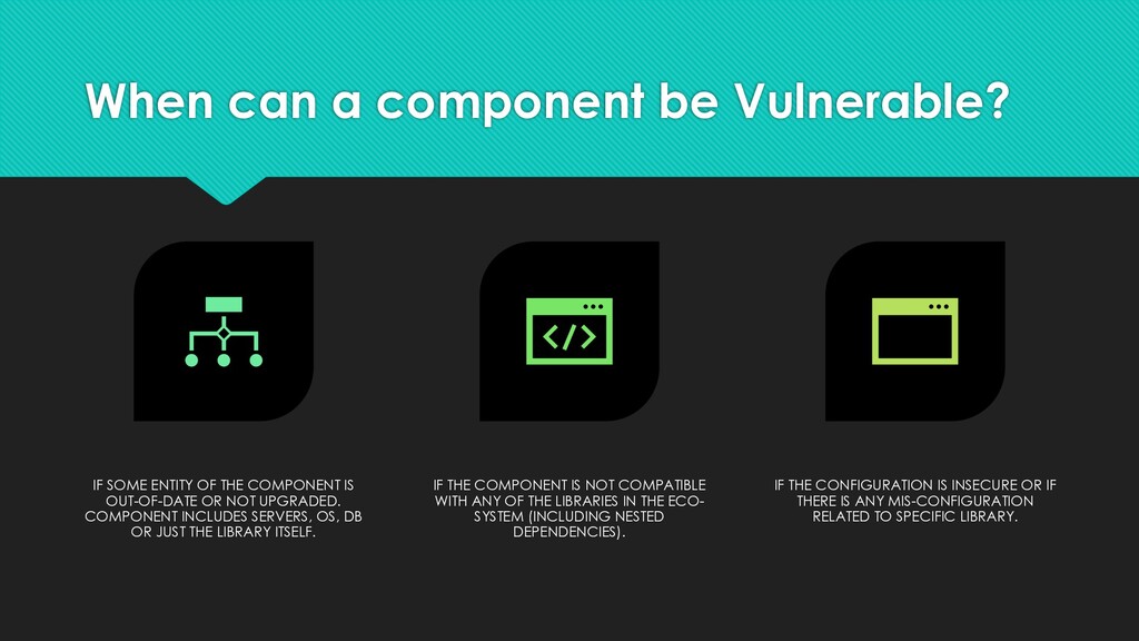 THE COMPONENT IS OUT-OF-DATE OR NOT UPGRADED. COMPONENT INCLUDES SERVERS, OS, DB OR JUST THE LIBRARY ITSELF. IF THE COMPONENT IS NOT COMPATIBLE WITH ANY OF THE LIBRARIES IN THE ECO- SYSTEM (INCLUDING NESTED DEPENDENCIES). IF THE CONFIGURATION IS INSECURE OR IF THERE IS ANY MIS-CONFIGURATION RELATED TO SPECIFIC LIBRARY.