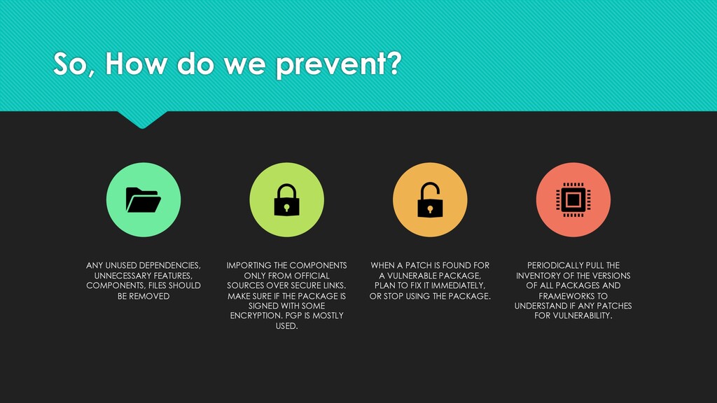 COMPONENTS, FILES SHOULD BE REMOVED IMPORTING THE COMPONENTS ONLY FROM OFFICIAL SOURCES OVER SECURE LINKS. MAKE SURE IF THE PACKAGE IS SIGNED WITH SOME ENCRYPTION. PGP IS MOSTLY USED. WHEN A PATCH IS FOUND FOR A VULNERABLE PACKAGE, PLAN TO FIX IT IMMEDIATELY, OR STOP USING THE PACKAGE. PERIODICALLY PULL THE INVENTORY OF THE VERSIONS OF ALL PACKAGES AND FRAMEWORKS TO UNDERSTAND IF ANY PATCHES FOR VULNERABILITY.
