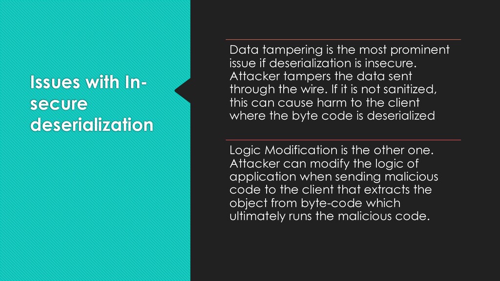 prominent issue if deserialization is insecure. Attacker tampers the data sent through the wire. If it is not sanitized, this can cause harm to the client where the byte code is deserialized Logic Modification is the other one. Attacker can modify the logic of application when sending malicious code to the client that extracts the object from byte-code which ultimately runs the malicious code.