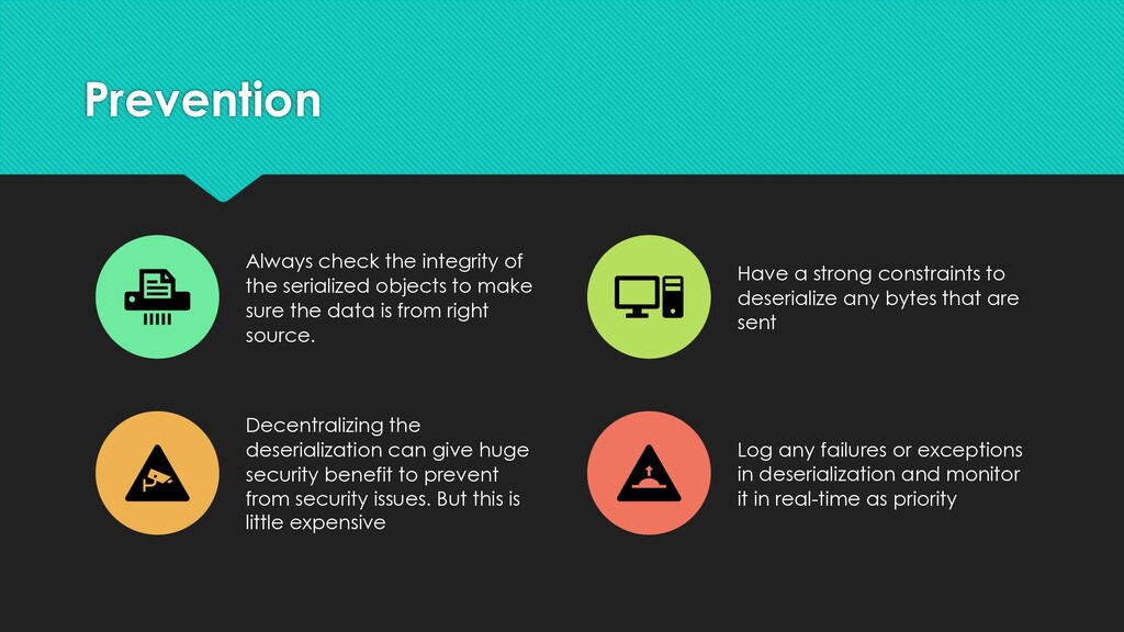 make sure the data is from right source. Have a strong constraints to deserialize any bytes that are sent Decentralizing the deserialization can give huge security benefit to prevent from security issues. But this is little expensive Log any failures or exceptions in deserialization and monitor it in real-time as priority