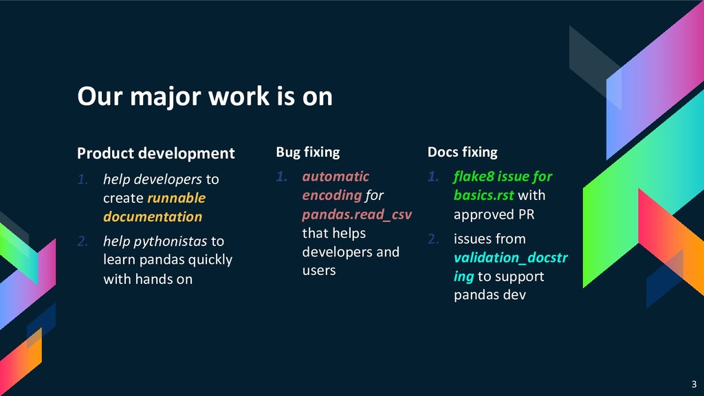 to create runnable documentation 2. help pythonistas to learn pandas quickly with hands on Bug fixing 1. automatic encoding for pandas.read_csv that helps developers and users Docs fixing 1. flake8 issue for basics.rst with approved PR 2. issues from validation_docstr ing to support pandas dev 3