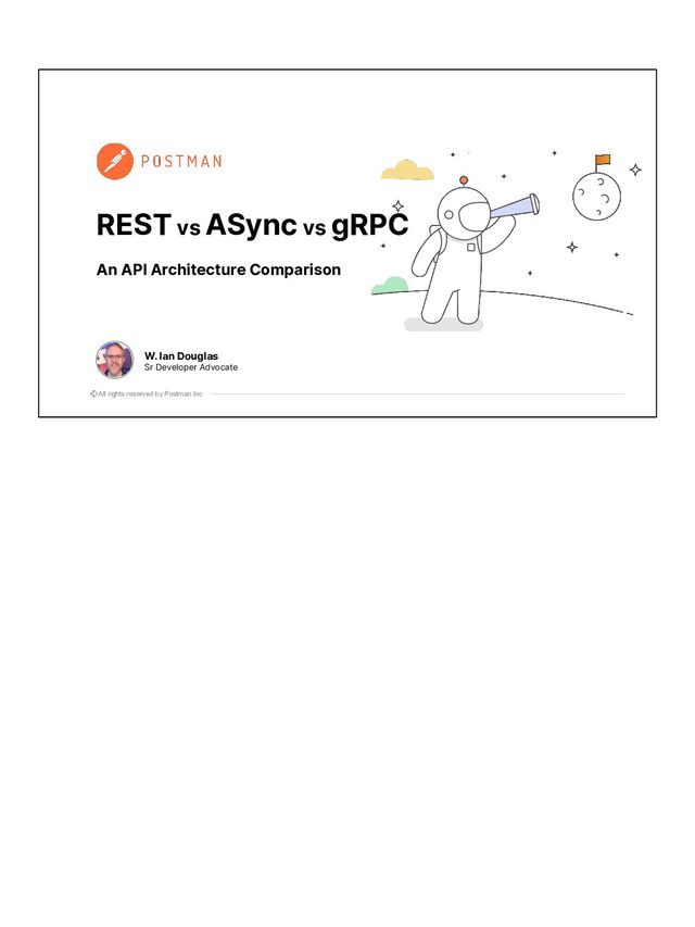 to message formatting is more difficult to plan. Not usually found in public-facing APIs. • Relies heavily on HTTP/2 HTTP/2 is great, but still has its own issues, which HTTP/3 will fix. (eventually…) • Third-party tooling is still new-ish Library and language support is still relatively new for various tech stacks. Some code generators exist, but tools are still in their infancy. Disadvantages of gRPC Because nothing’s perfect … @getpostman @iandouglas736 Adoption of gRPC is low, but we are seeing growth. At Postman, we’re mostly seeing gRPC APIs happening within internal networks to communicate server to server, not so much from an end user client like a browser. Because it’s based on HTTP/2, and using protocol buffers, you need some proxy libraries in JavaScript to communicate with gRPC from a browser. We’ll see improvements here over time. HTTP/2, as an aside, has its own issues around DOS attacks and security issues, which are being addressed in HTTP/3 which is already out, but HTTP/2 isn’t even well adopted itself yet, so there may be more changes to gRPC and even async APIs over time as problems with HTTP/2 are addressed. As time goes on, the tools will get better, and gRPC is definitely worth the time to investigate as a feasible solution for the minimized latency and data transfer alone.