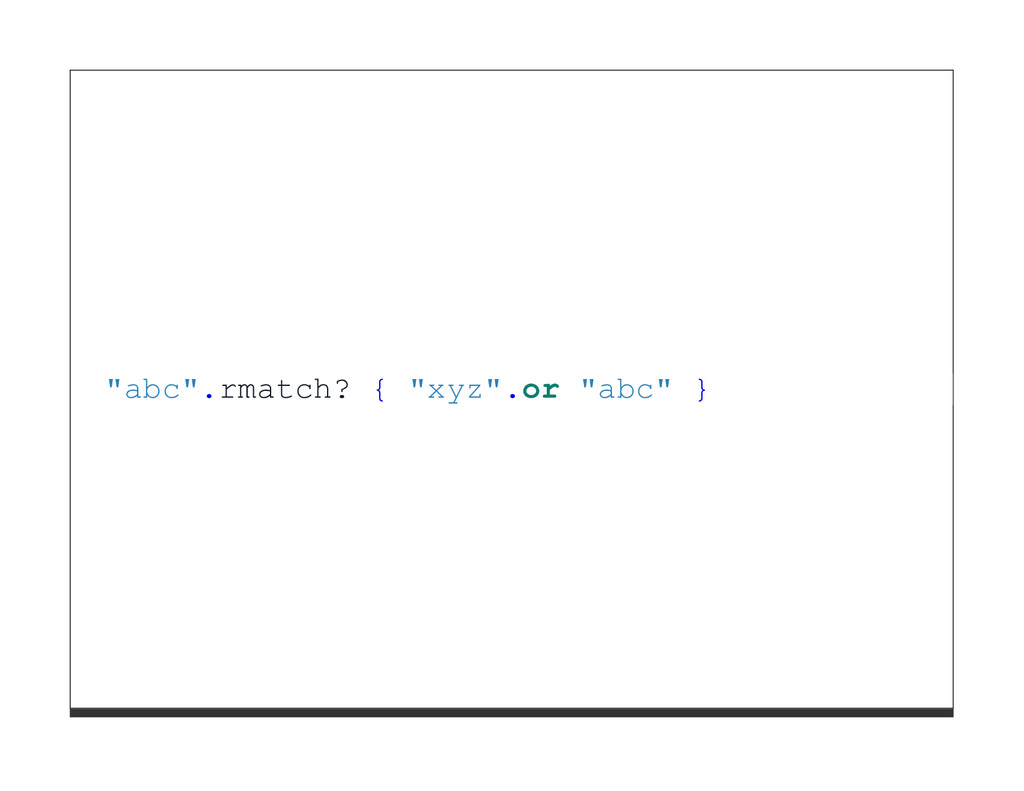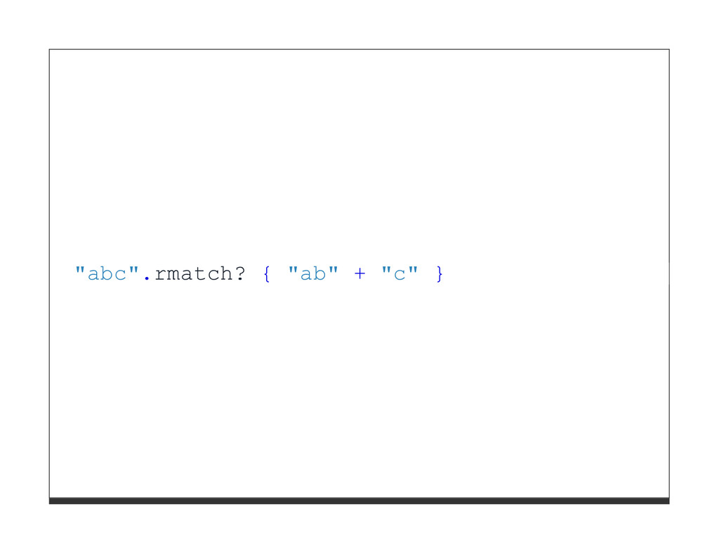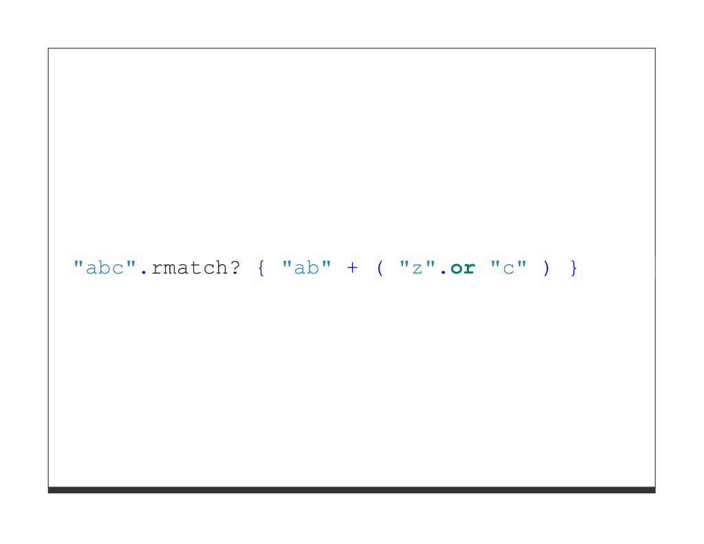 "abc".rmatch? { "ab" + ( "z".or "c" ) }