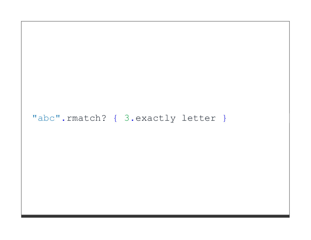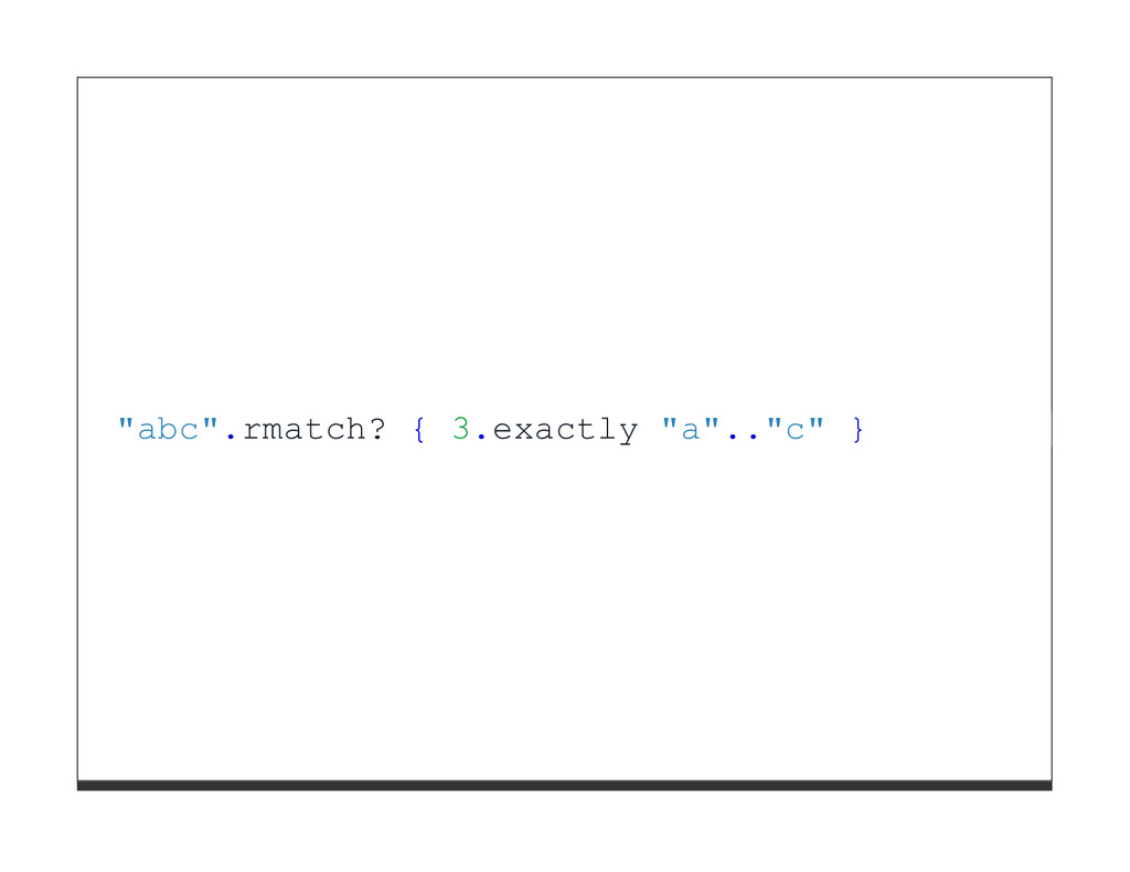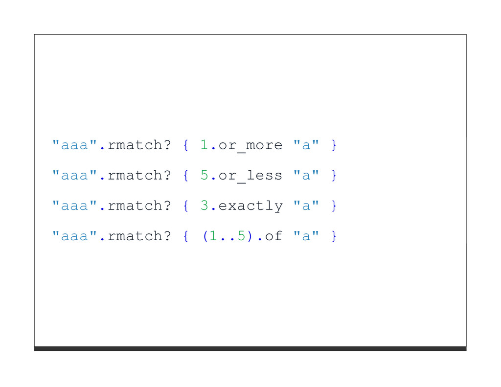 "aaa".rmatch? { 3.exactly "a" } "aaa".rmatch? { (1..5).of "a" }