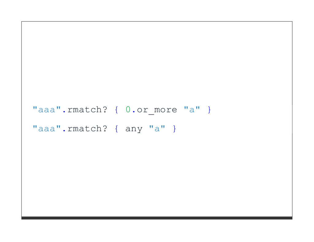 "aaa".rmatch? { 0.or_more "a" } "aaa".rmatch? { any "a" }