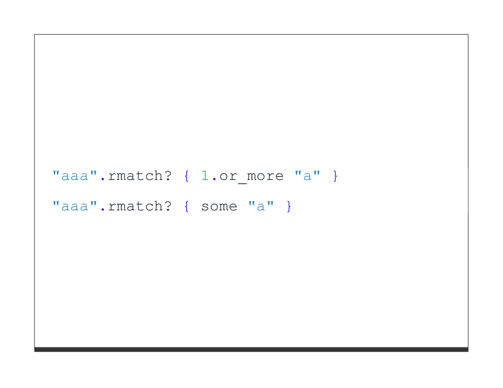"aaa".rmatch? { 1.or_more "a" } "aaa".rmatch? { some "a" }