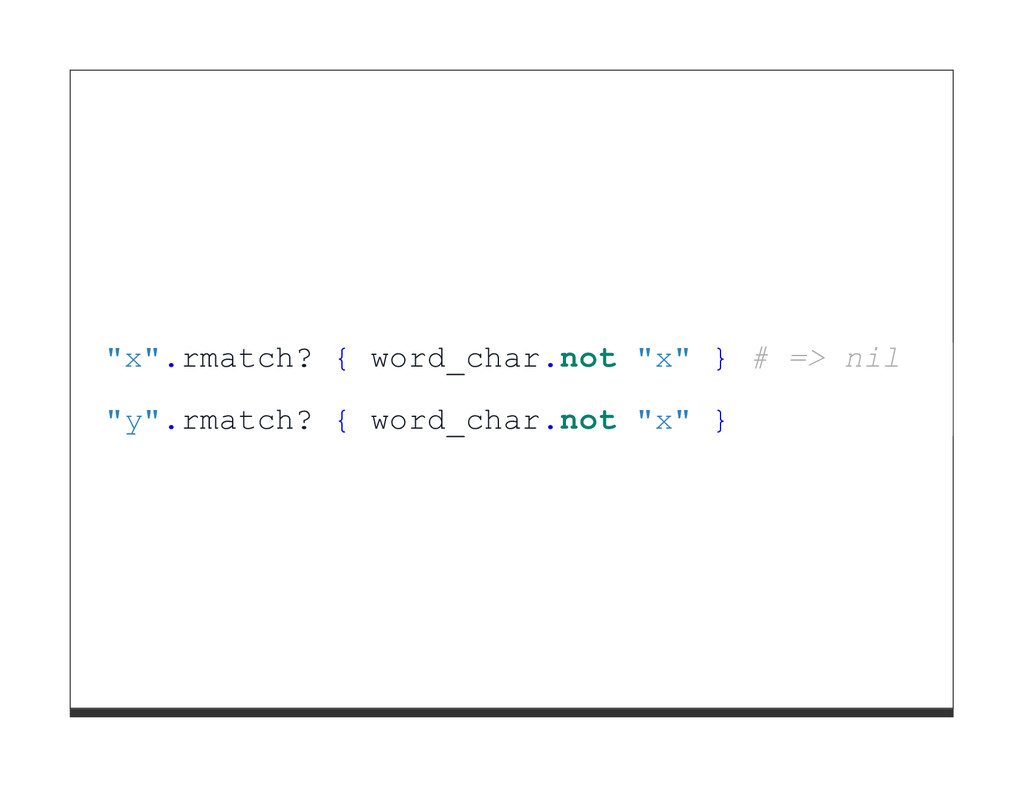 "x".rmatch? { word_char.not "x" } # => nil "y".rmatch? {