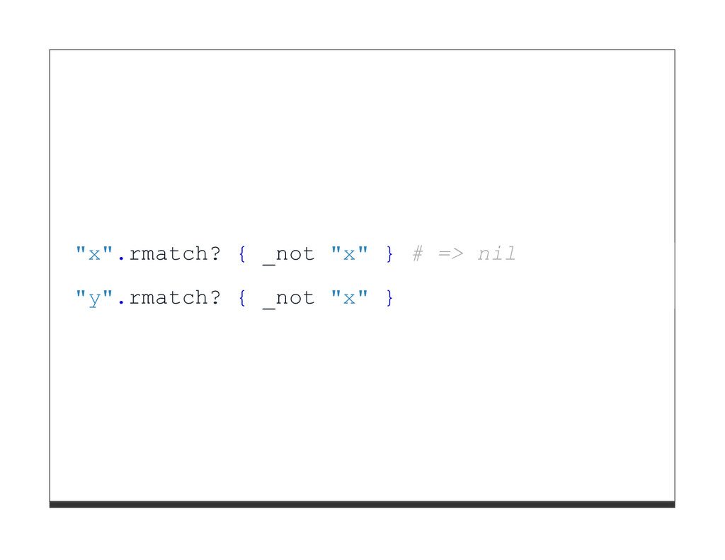 "x".rmatch? { _not "x" } # => nil "y".rmatch? {