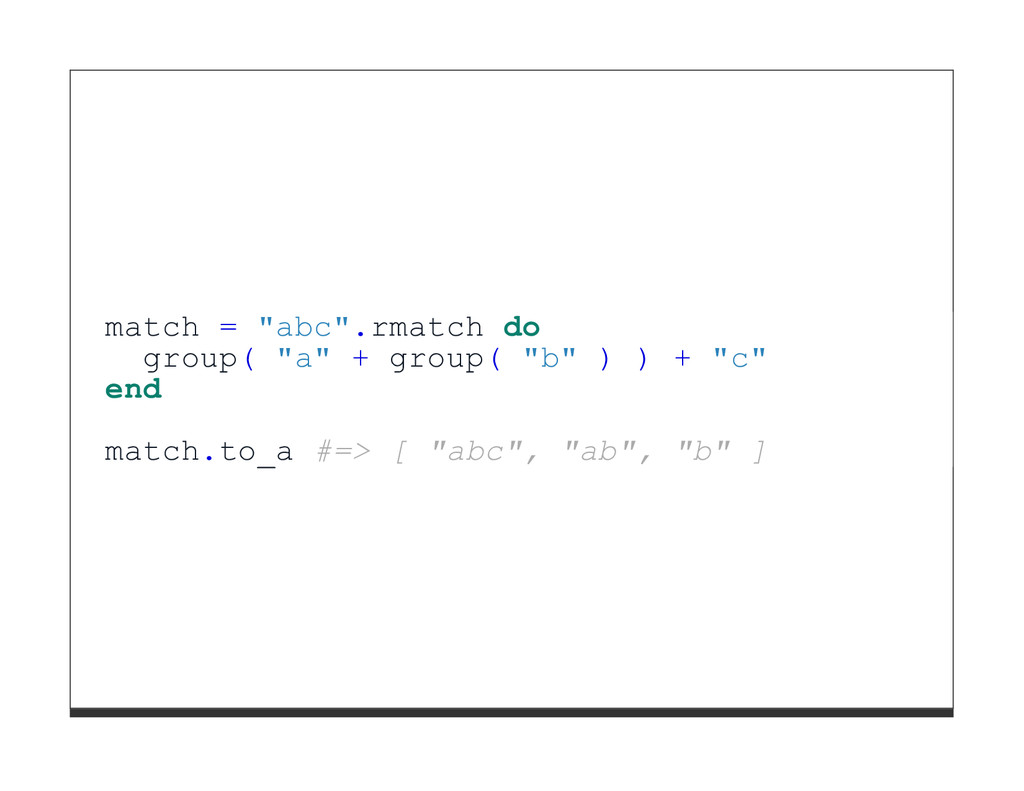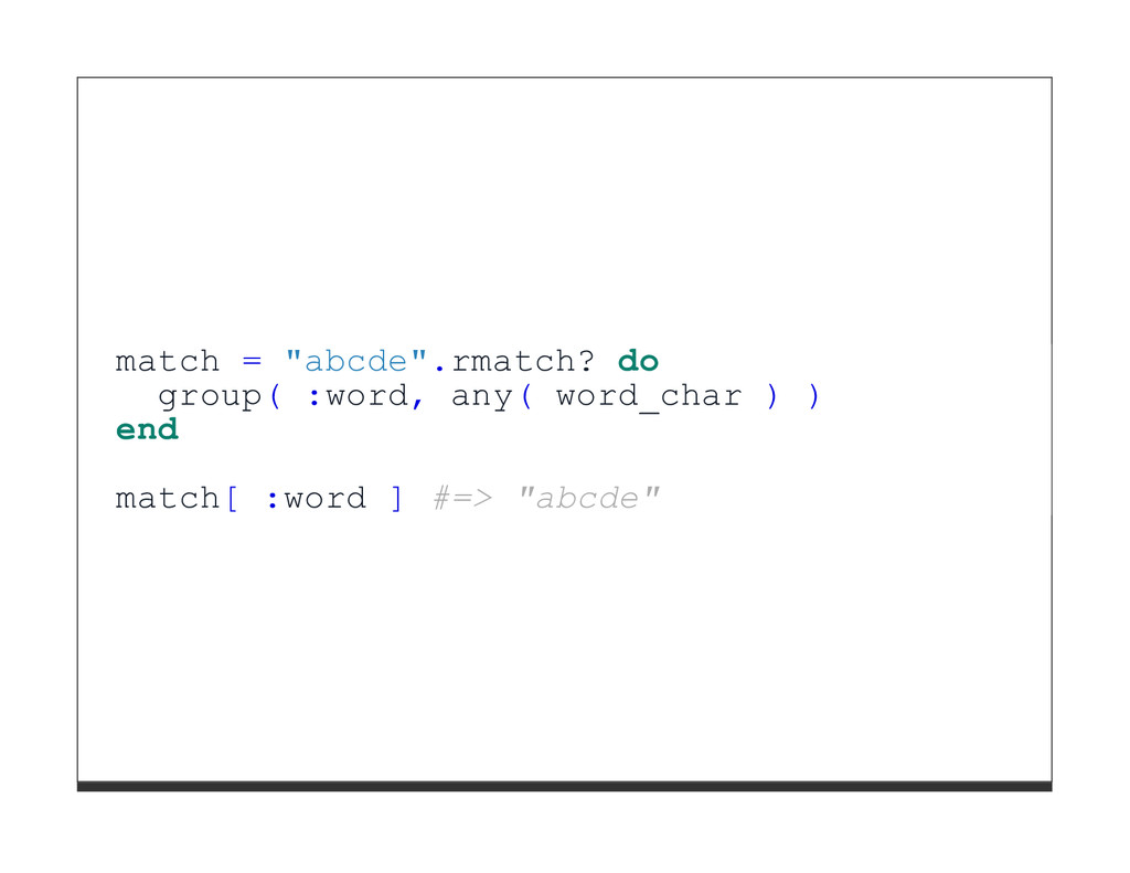 match = "abcde".rmatch? do group( :word, any( word_char ) )