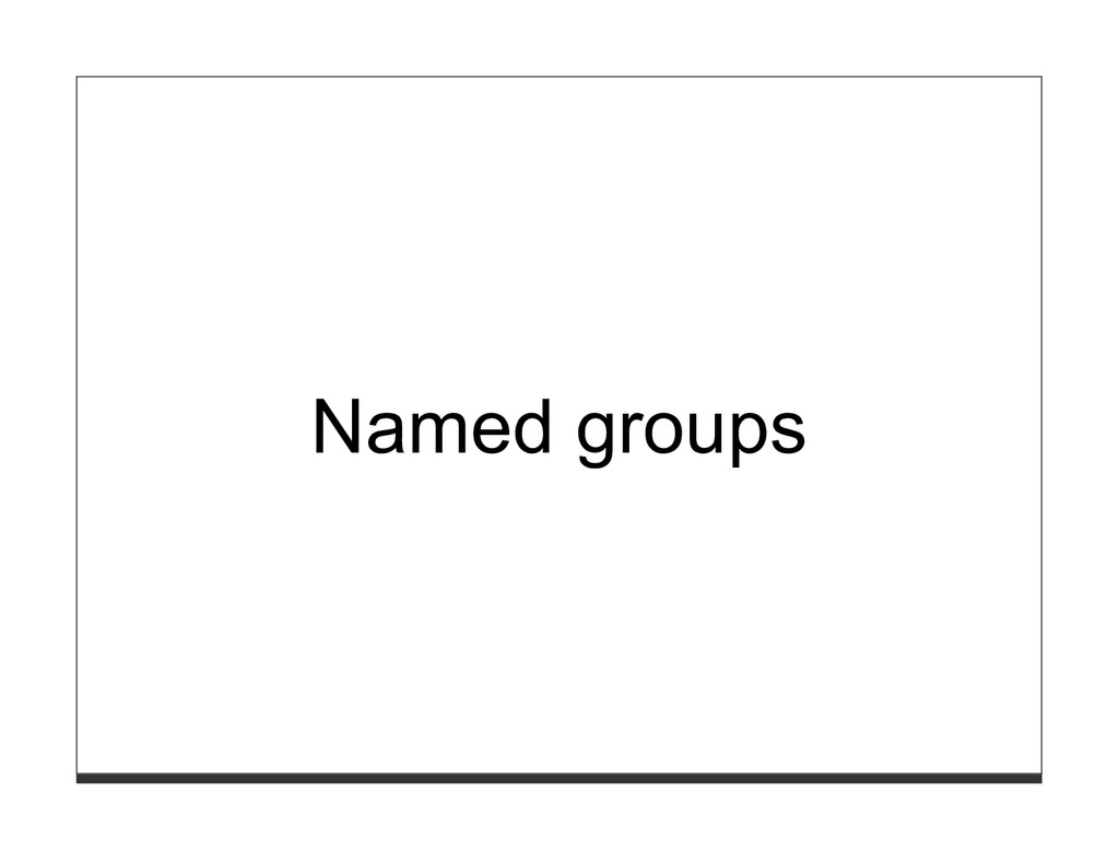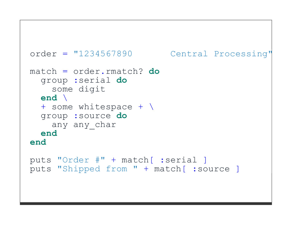:serial do some digit end \ + some whitespace + \ group :source do any any_char end end puts "Order #" + match[ :serial ] puts "Shipped from " + match[ :source ]