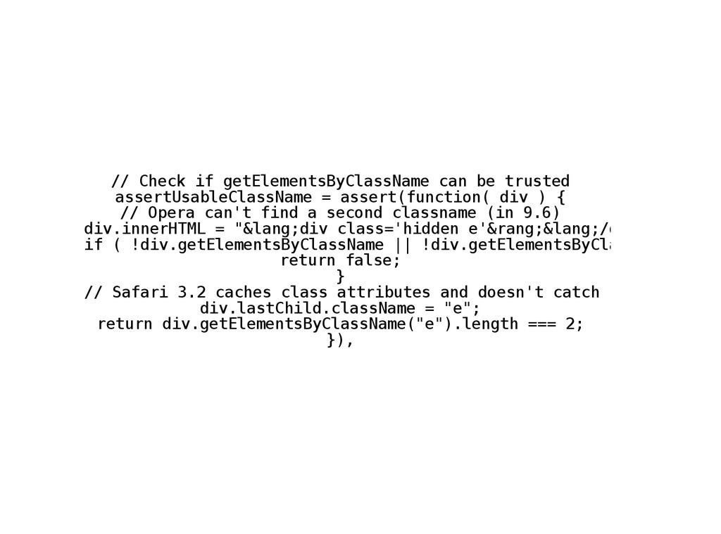 e t E l e m e n t s B y C l a s s N a m e c a n b e t r u s t e d a s s e r t U s a b l e C l a s s N a m e = a s s e r t ( f u n c t i o n ( d i v ) { / / O p e r a c a n ' t f i n d a s e c o n d c l a s s n a m e ( i n 9 . 6 ) d i v . i n n e r H T M L = " & l a n g ; d i v c l a s s = ' h i d d e n e ' & r a n g ; & l a n g ; / d i v & r a n g ; & l a i f ( ! d i v . g e t E l e m e n t s B y C l a s s N a m e | | ! d i v . g e t E l e m e n t s B y C l a s s N a m e ( " e " ) r e t u r n f a l s e ; } / / S a f a r i 3 . 2 c a c h e s c l a s s a t t r i b u t e s a n d d o e s n ' t c a t c h c h a n g e s d i v . l a s t C h i l d . c l a s s N a m e = " e " ; r e t u r n d i v . g e t E l e m e n t s B y C l a s s N a m e ( " e " ) . l e n g t h = = = 2 ; } ) ,