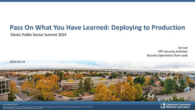Presentation about the LLNL experience with deploying Elastic into production over the past year. Discussion of both the good things we've seen, as well as a variety of warts we've found along the way.
