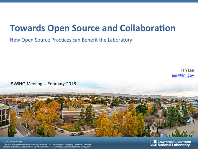 U.S. Department of Energy by Lawrence Livermore National Laboratory under contract DE-AC52-07NA27344. Lawrence Livermore National Security, LLC Towards Open Source and Collabora3on How Open Source Prac/ces can Benefit the Laboratory Ian Lee [email protected] SWING Meeting – February 2016