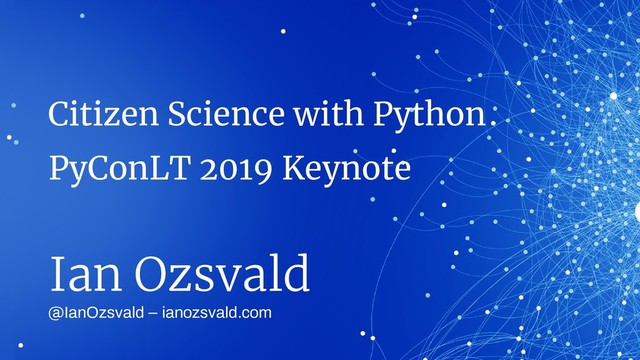 Given at PyConLT 2019, I talk on dirty air analysis in North Macedonia, monitoring relocated Orangutangs with drones and SciPy, improving child-birth with scikit-learn and improving political engagement with R and Python.