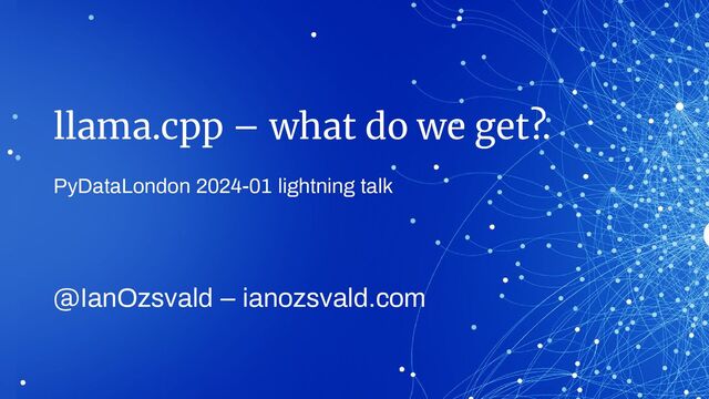 A 5 minute lightning talk introducing llama.cpp, showing how we can run gguf models on the CPU without needing a GPU. I show llama2, WizardCoder and Llava multimodal, with command line arguments and links to the source gguf files.