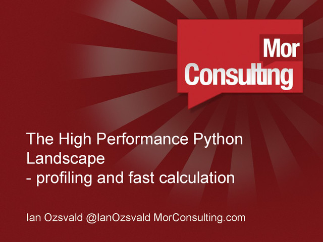 learning curve (pure Py only) easy win? • ShedSkin easy (pure Py only) but fairly rare • Cython pure Py hours to learn – team cost low (and lots of online help) • Cython numpy OMP days+ to learn – heavy team cost? • Numba/Pythran hours to learn, install a bit tricky (Anaconda easiest for Numba) • Pythran OMP very impressive result for little effort • Numba big toolchain which might hurt productivity? • (numexpr not covered – great for numpy and easy to use)