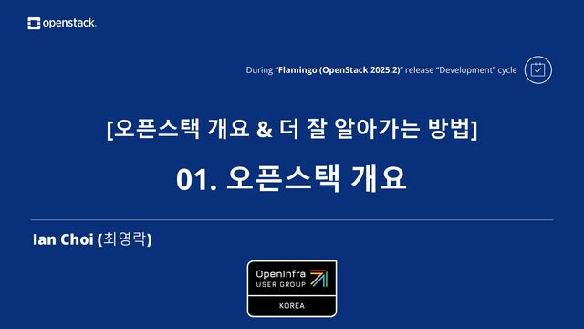 서밋 & 미팅에 맞추어 계획됨 • 2016년까지 OpenStack Summit에서 개발자 회의가 진행됨 (OpenStack Design Summit) • 2017년부터 PTG (Project Team Gathering)이라는 이름으로 별도 개발자 행사 개최 • 기본적으로 업그레이드 버전업 미지원 (최근부터 지원하기 시작) • 새로운 특징 및 핵심 기능들은 보통 1년을 주기로 많은 변화가 생김 릴리즈 이름 릴리즈 일자 포함된 컴포넌트 코드 이름 Austin 21 October 2010 Nova, Swift Bexar 3 February 2011 Nova, Glance, Swift Cactus 15 April 2011 Nova, Glance, Swift Diablo 22 September 2011 Nova, Glance, Swift Essex 5 April 2012 Nova, Glance, Swift, Horizon, Keystone Folsom 27 September 2012 Nova, Glance, Swift, Horizon, Keystone, Quantum, Cinder Grizzly 4 April 2013 Nova, Glance, Swift, Horizon, Keystone, Quantum, Cinder Havana 17 October 2013 Nova, Glance, Swift, Horizon, Keystone, Neutron, Cinder, Heat, Ceilometer Icehouse 17 April 2014 + Trove Juno 16 October 2014 + Sahara Kilo 30 April 2015 + Ironic Liberty 15 October 2015 + Zaqar, Manila, Designate, Barbican, Searchlight Mitaka 7 April 2016 + Magnum Newton 6 October 2016 + >10 components Ocata 22 February 2017 Pike 30 August 2018 Queens 28 February 2018 Rocky 30 August 2018 + 이후 계속 주기적인 릴리스가 이루어지고 있음: Stein (2019-04-10), Train (2019-10-16), Ussuri (2020-05-13), Victoria (2020- 10-14), Wallaby (2021-04-14), Xena (2021-10-06), Yoga (2022-03-30), Zed (2022-10-05), 2023.1 (Antelope, 2023-03-22), 2023.2 (Bobcat, 2023-10-04), 2024.1 (Caracal, 2024-04-03), 2024.2 (Dalmatian, 2024-10-02), 2025.1 (Epoxy, 2025-04-02), 2025.2 (Flamingo, 2025-10-01 estimated)