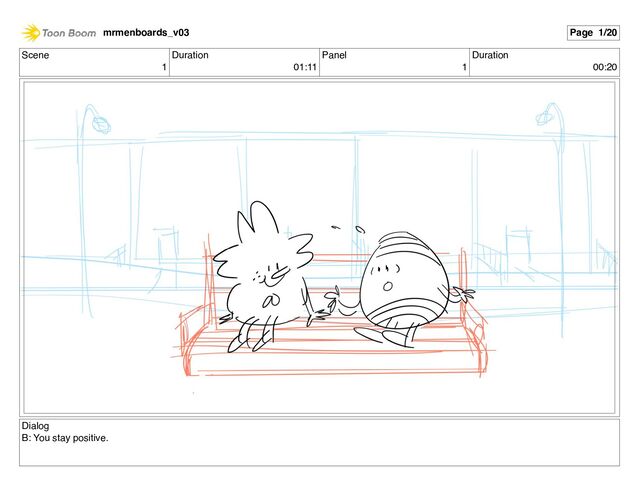 Scene 1 Duration 01:11 Panel 1 Duration 00:20 Dialog B: