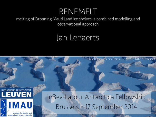 modelling and observational approach Jan Lenaerts InBev-Latour Antarctica Fellowship Brussels – 17 September 2014 Melt ponds on Melt ponds on Ross ice shelf, late summer