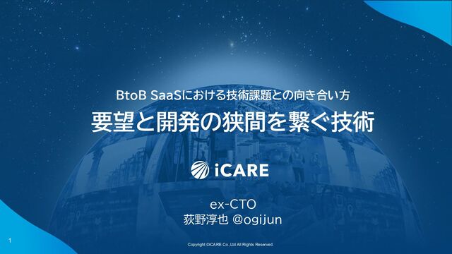 Copyright ©iCARE Co.,Ltd All Rights Reserved. 1 BtoB SaaSにおける技術課題との向き合い方 要望と開発の狭間を繋ぐ技術
