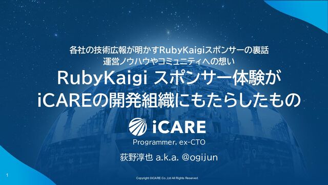 Copyright ©iCARE Co.,Ltd All Rights Reserved. 1 各社の技術広報が明かすRubyKaigiスポンサーの裏話 運営ノウハウやコミュニティへの想い RubyKaigi