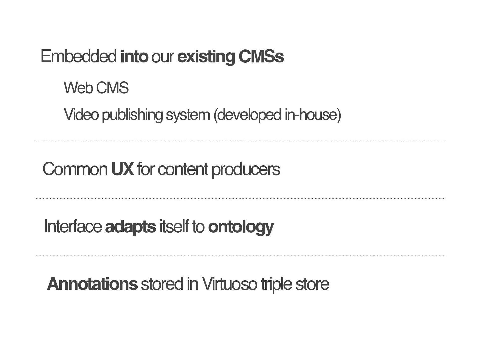 (developed in-house) Common UX for content producers Interface adapts itself to ontology Annotations stored in Virtuoso triple store