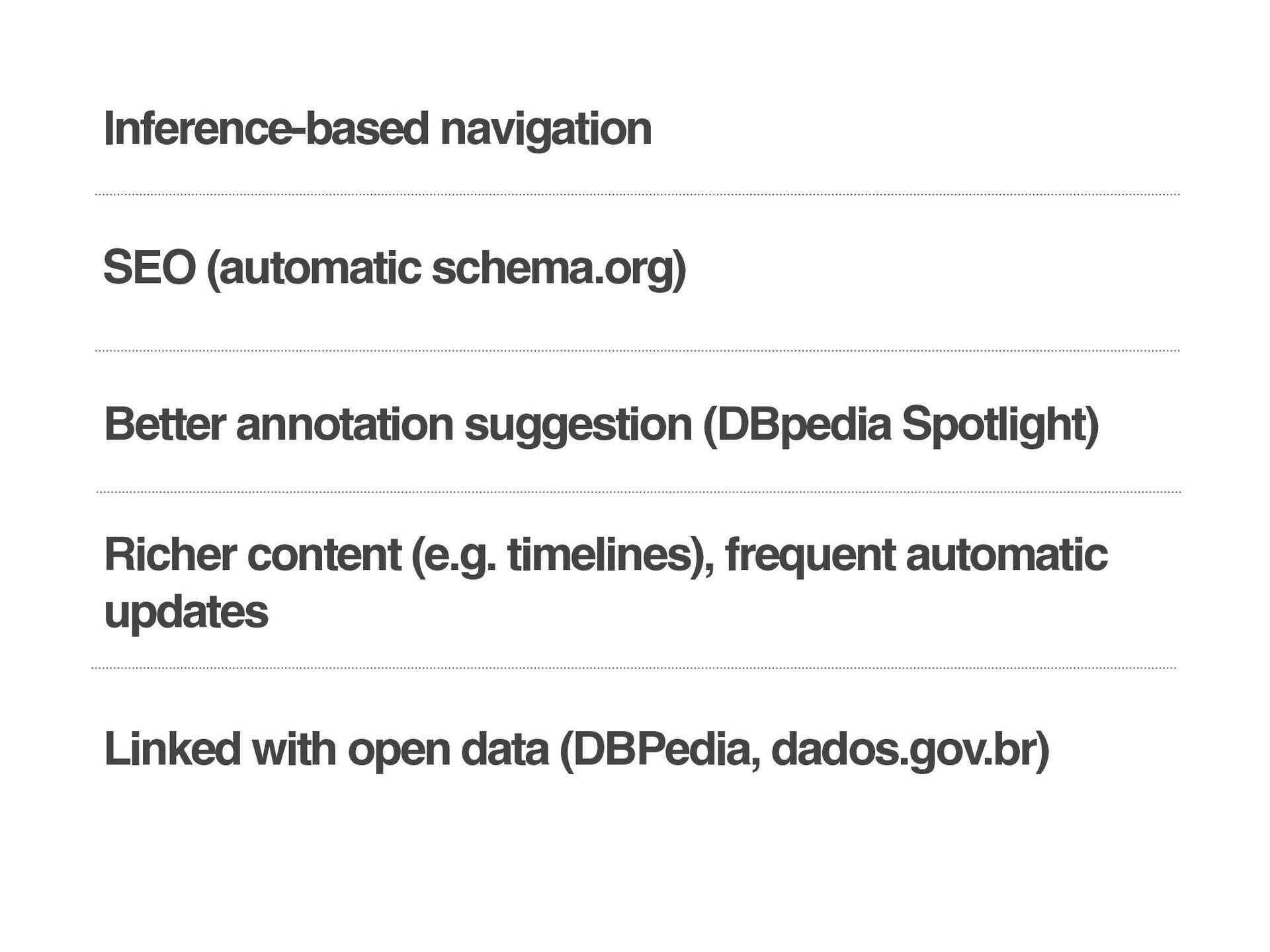 automatic updates Better annotation suggestion (DBpedia Spotlight) Linked with open data (DBPedia, dados.gov.br)