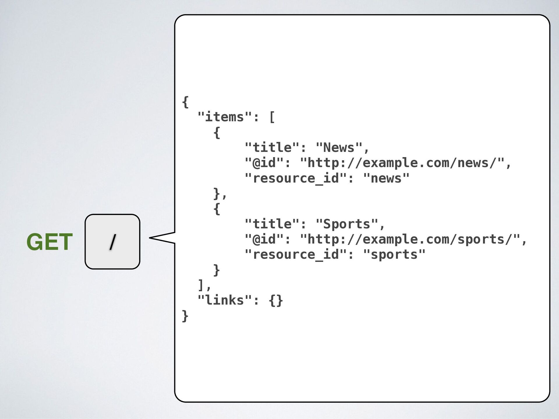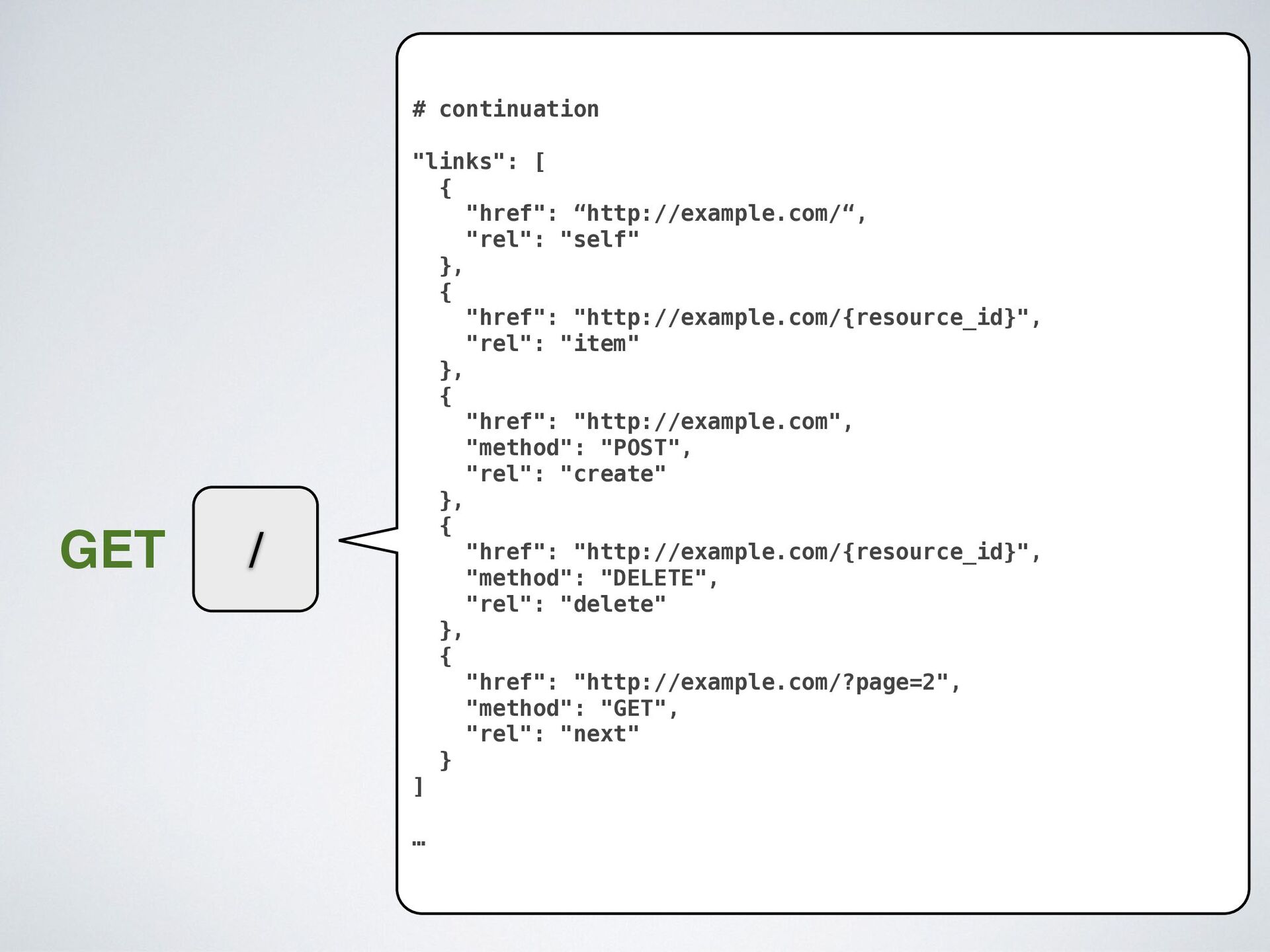 "self" }, { "href": "http://example.com/{resource_id}", "rel": "item" }, { "href": "http://example.com", "method": "POST", "rel": "create" }, { "href": "http://example.com/{resource_id}", "method": "DELETE", "rel": "delete" }, { "href": "http://example.com/?page=2", "method": "GET", "rel": "next" } ] …