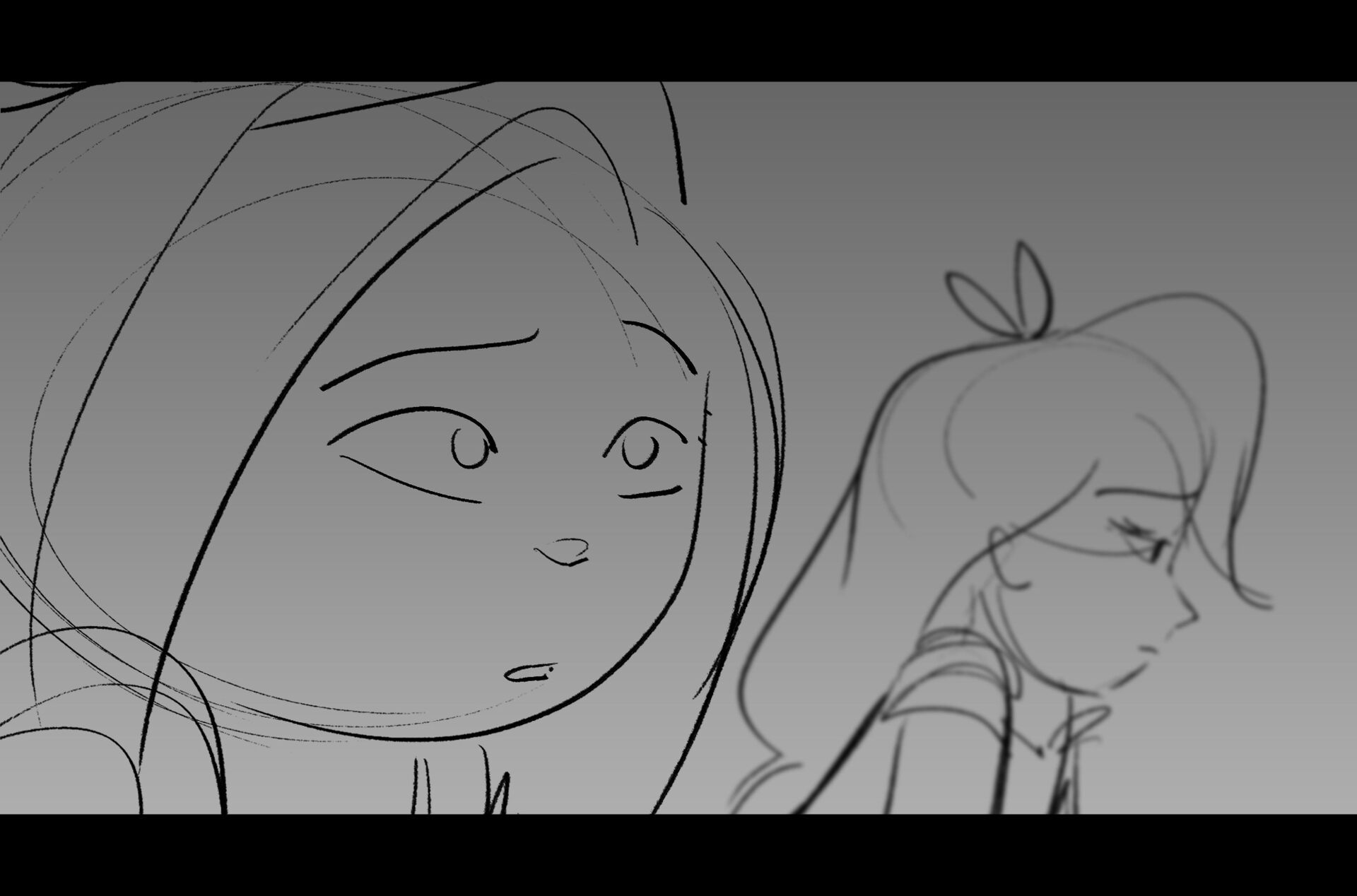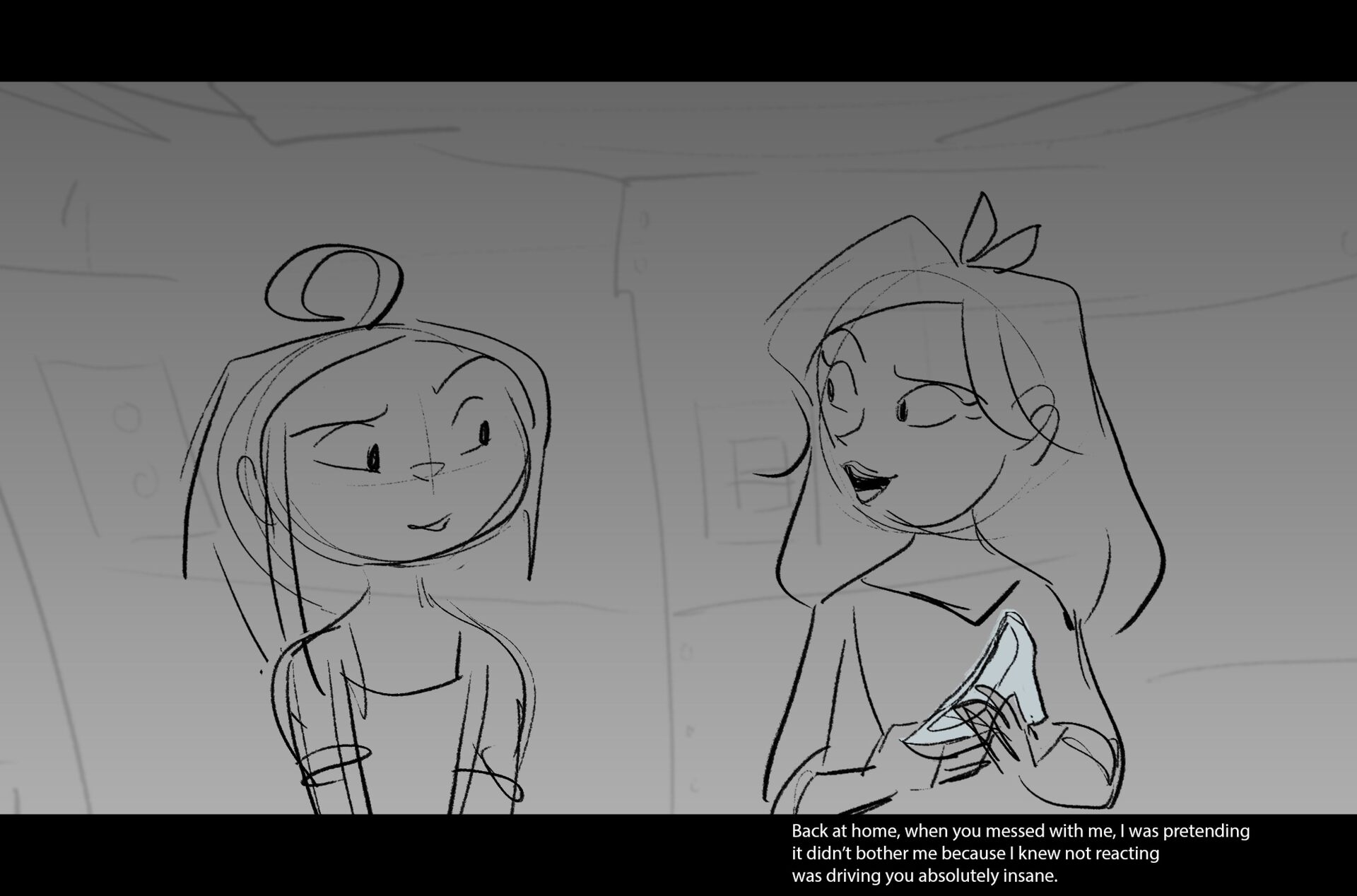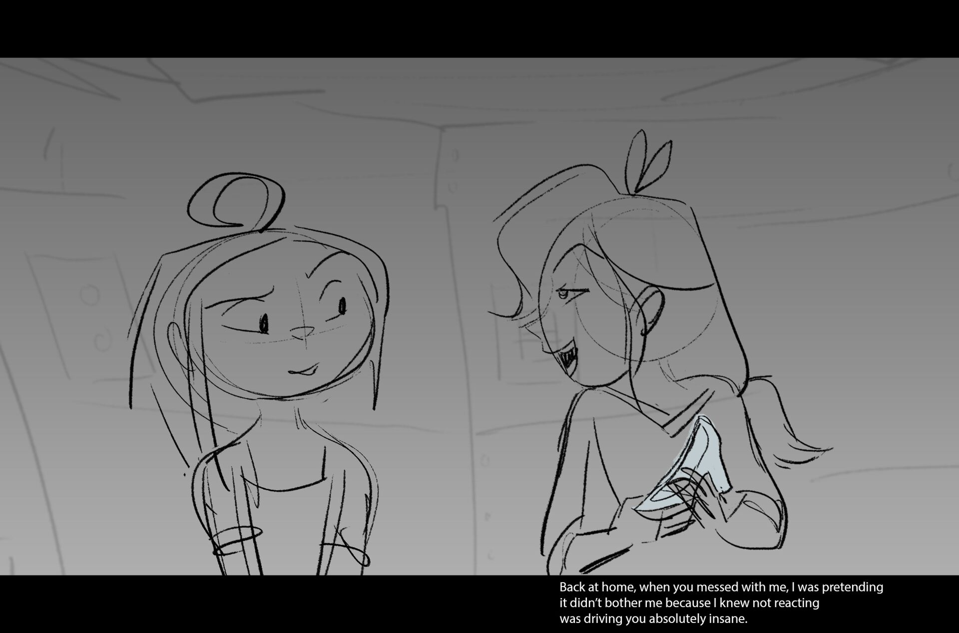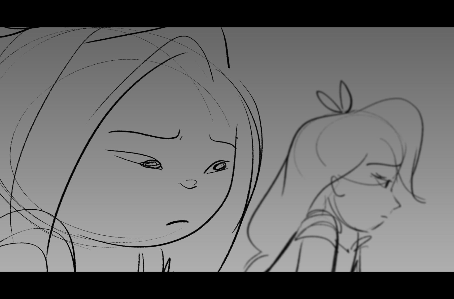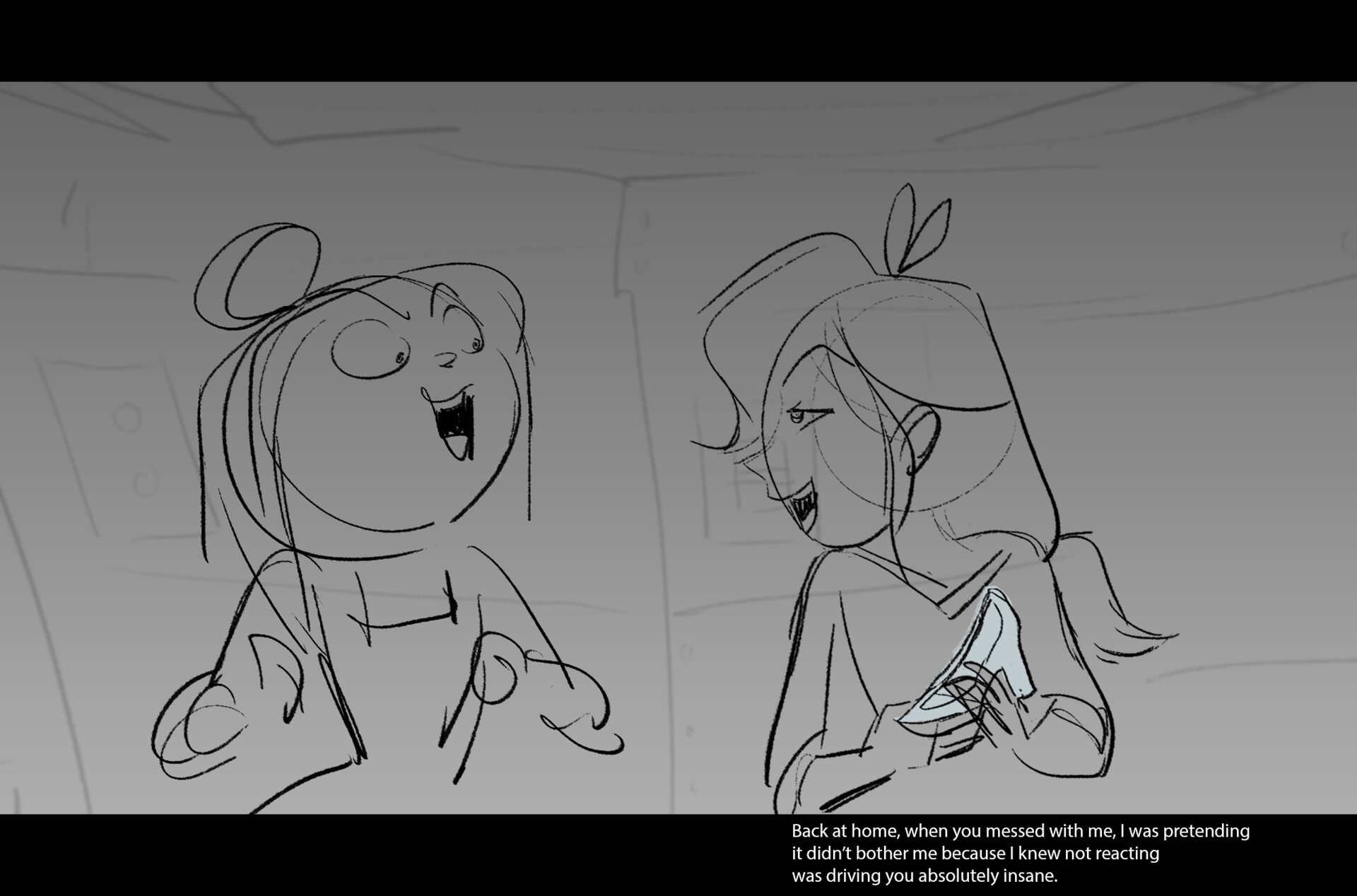 Drama/acting: A sequence I storyboarded from script pages. Because this scene is preceded by a big action scene with an intense fight between Lilith and Cinderella, I really wanted to slow things down and keep the camera simple for this first moment of real, sincere bonding between the sisters. Property of Netflix Animation Studios, 2024.