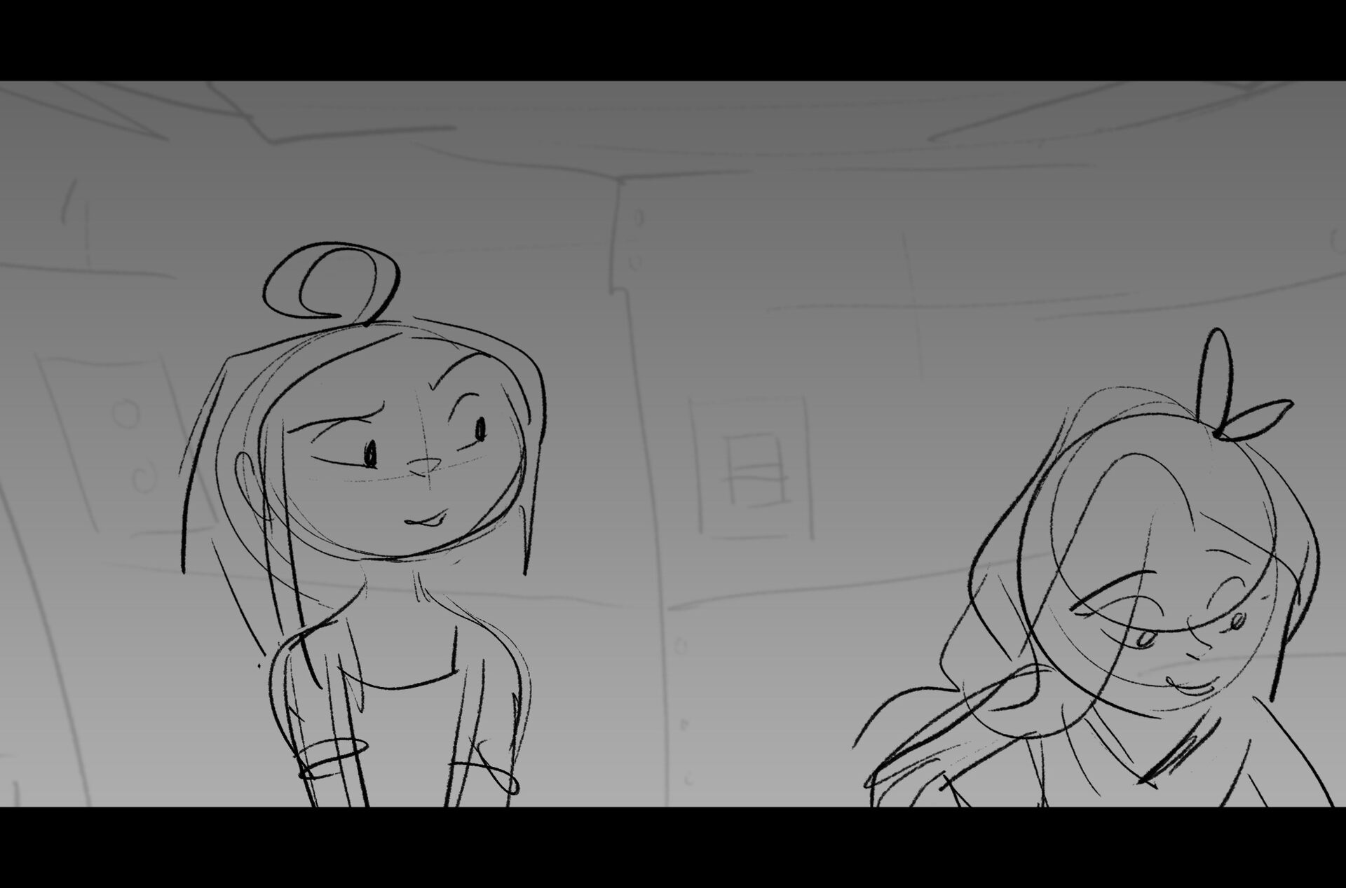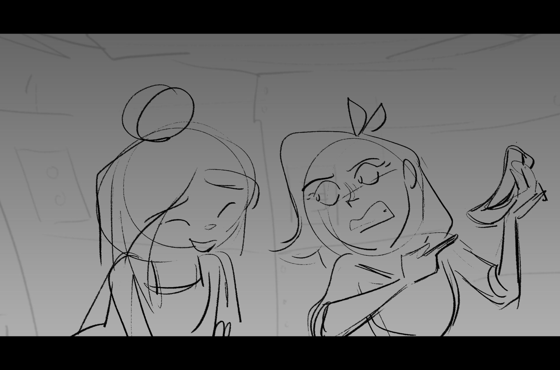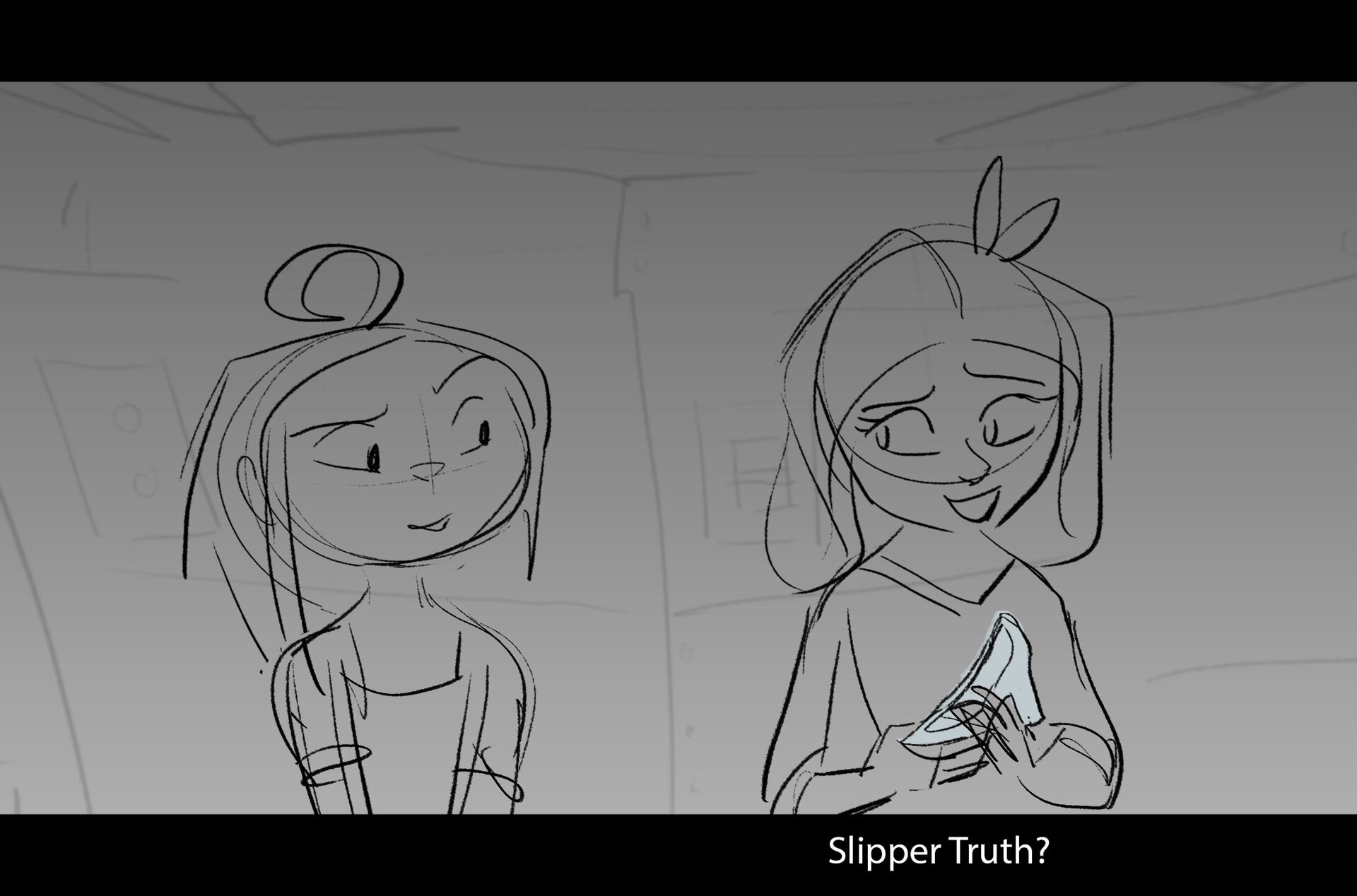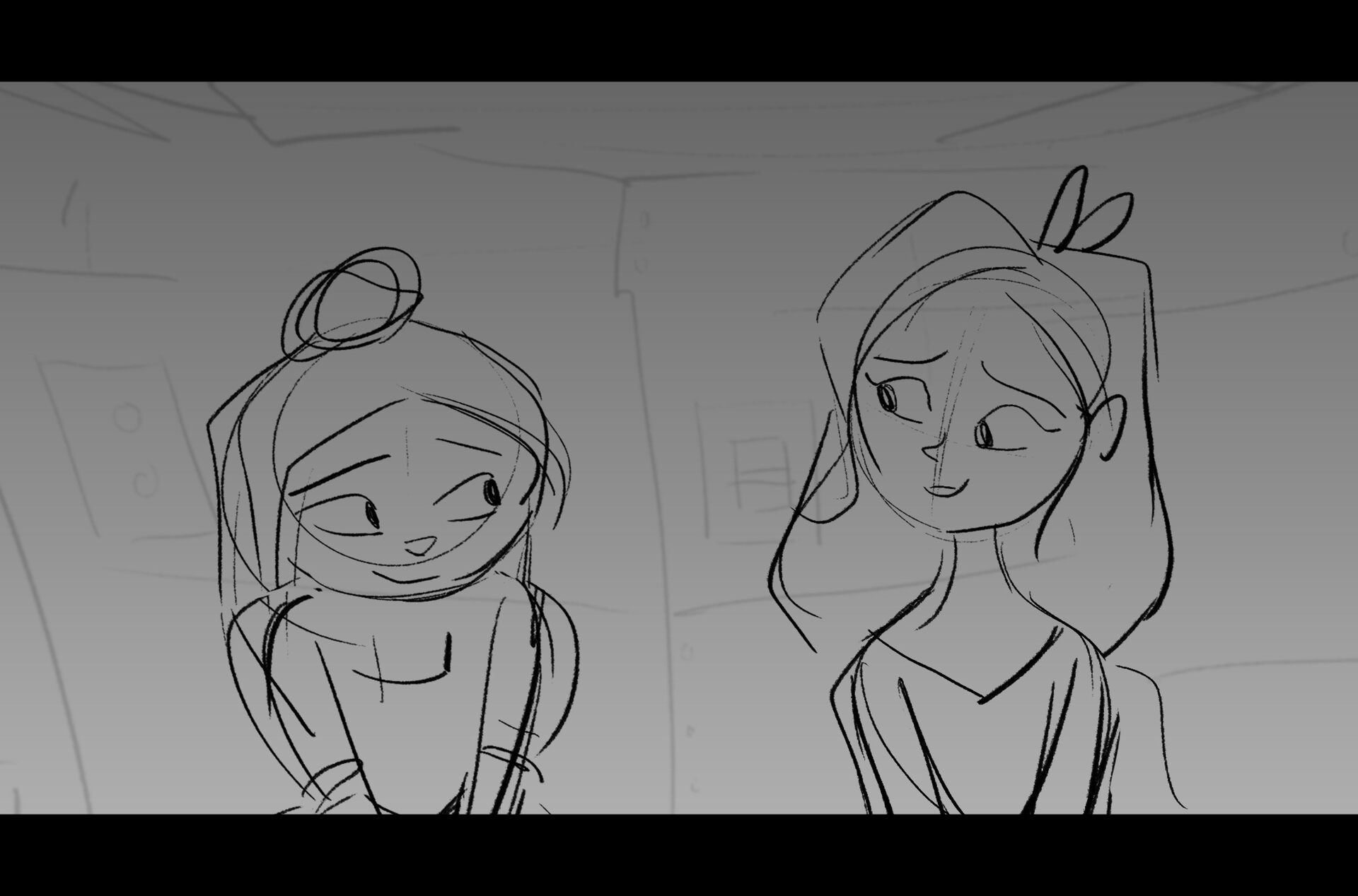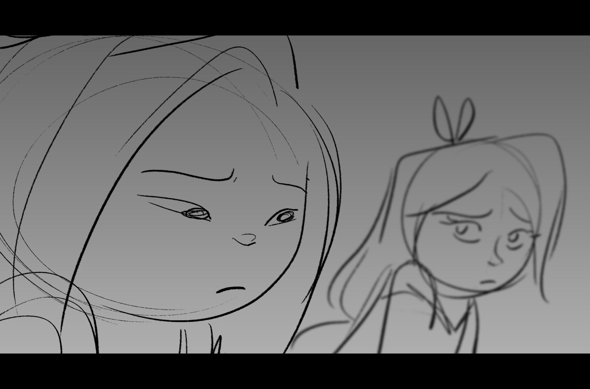 Drama/acting: A sequence I storyboarded from script pages. Because this scene is preceded by a big action scene with an intense fight between Lilith and Cinderella, I really wanted to slow things down and keep the camera simple for this first moment of real, sincere bonding between the sisters. Property of Netflix Animation Studios, 2024.