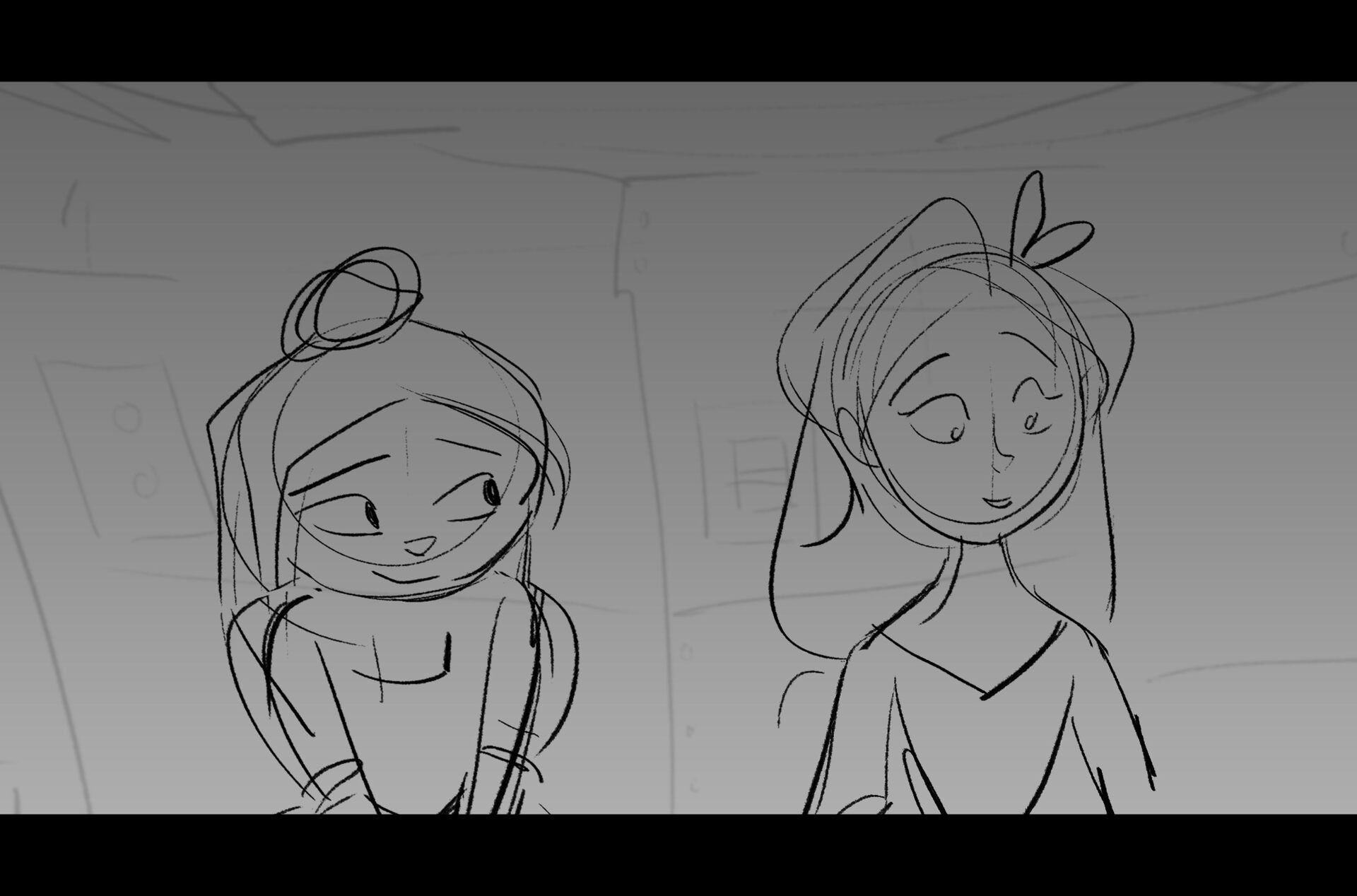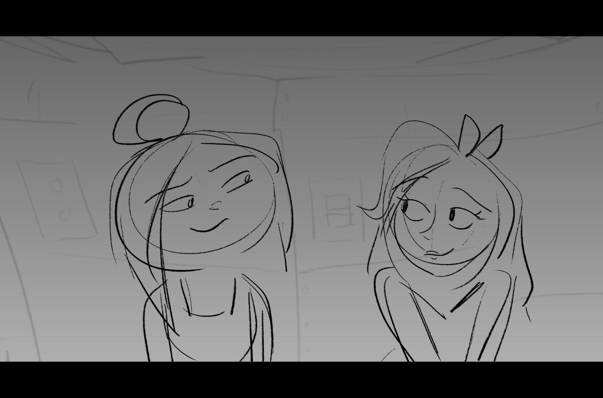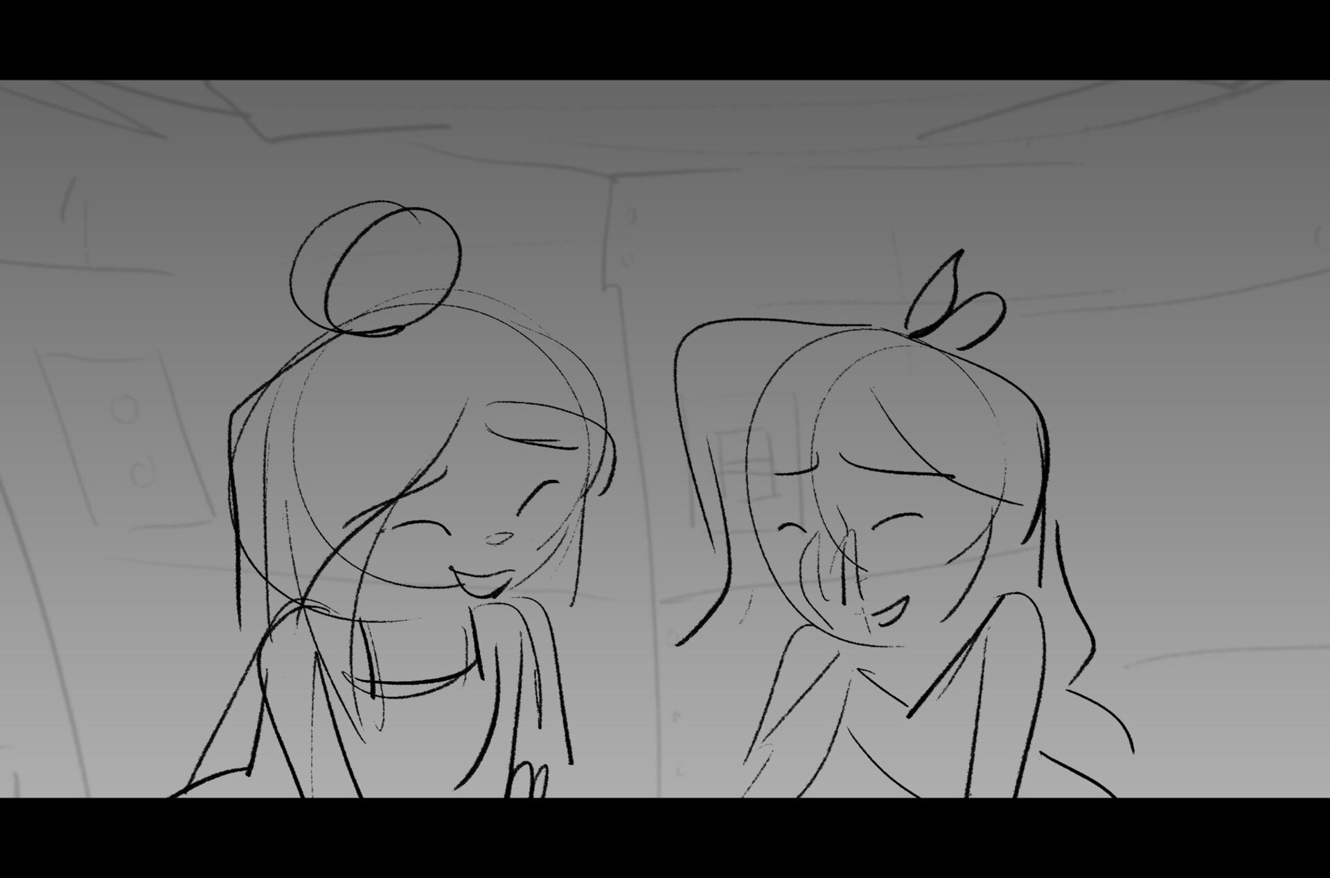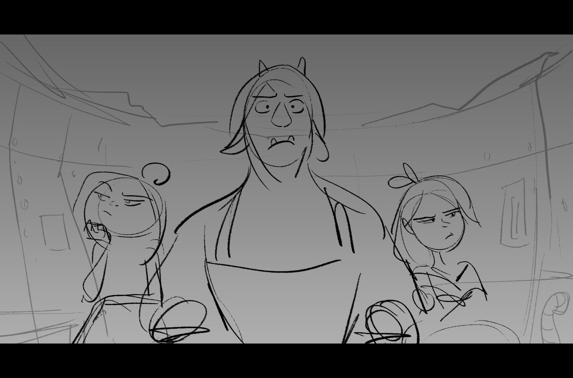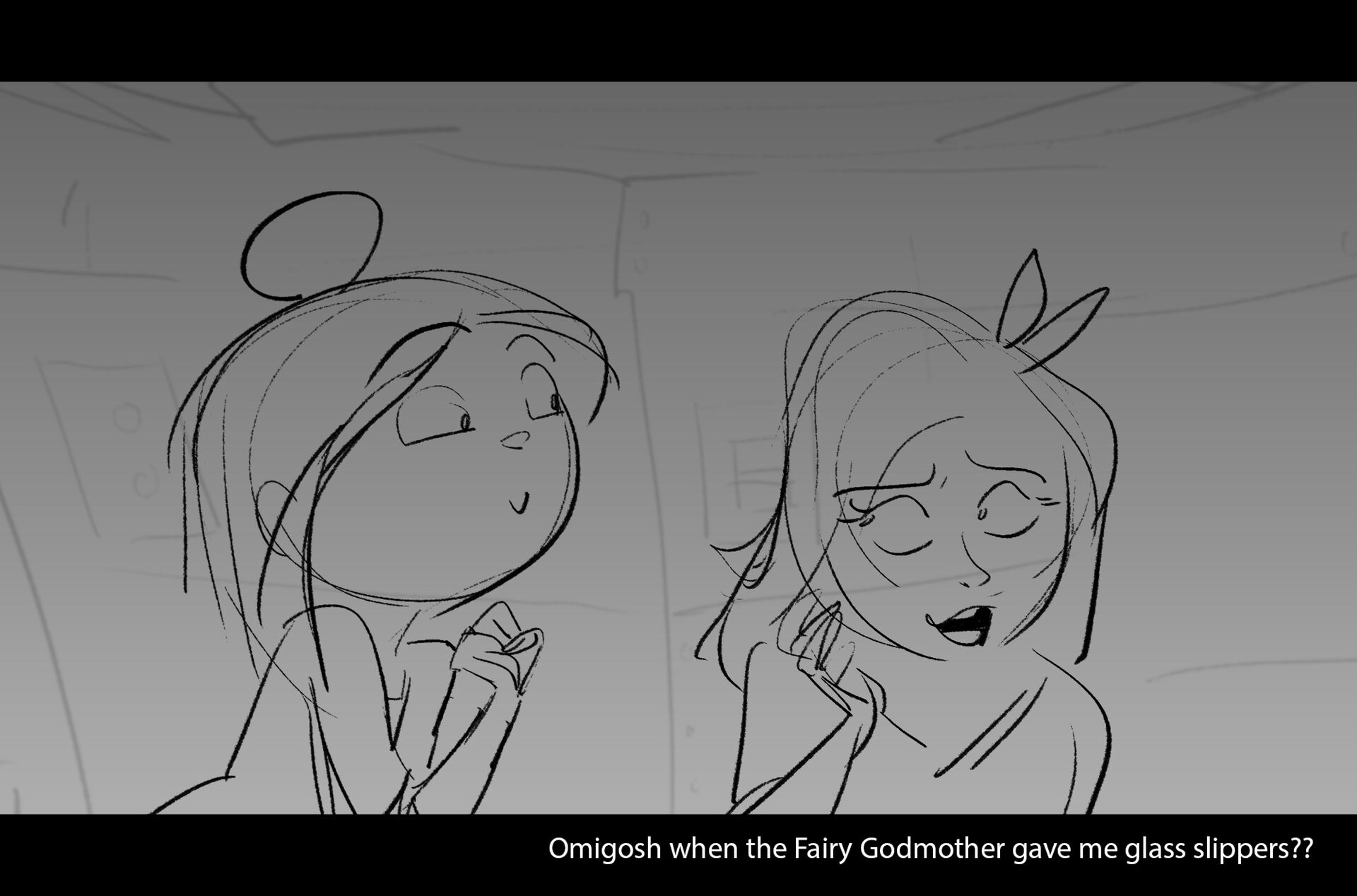 Drama/acting: A sequence I storyboarded from script pages. Because this scene is preceded by a big action scene with an intense fight between Lilith and Cinderella, I really wanted to slow things down and keep the camera simple for this first moment of real, sincere bonding between the sisters. Property of Netflix Animation Studios, 2024.