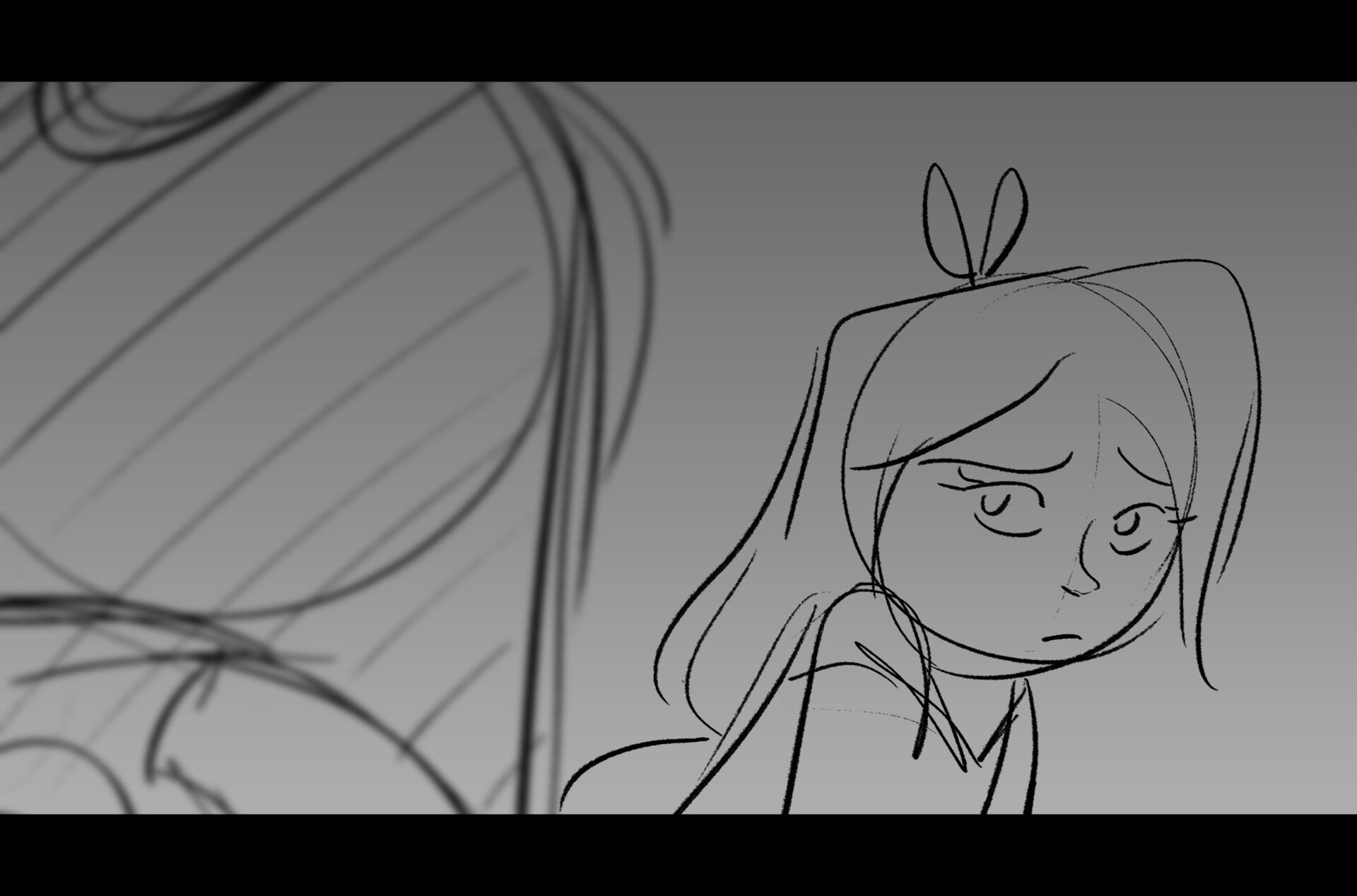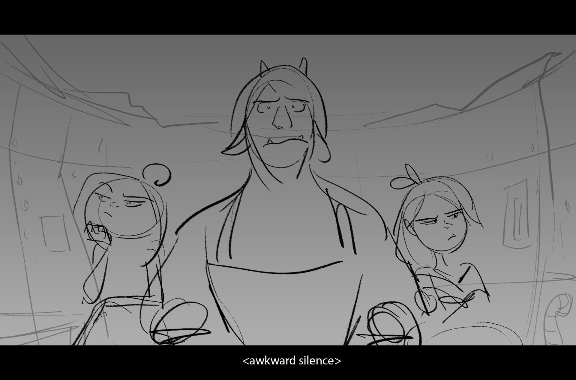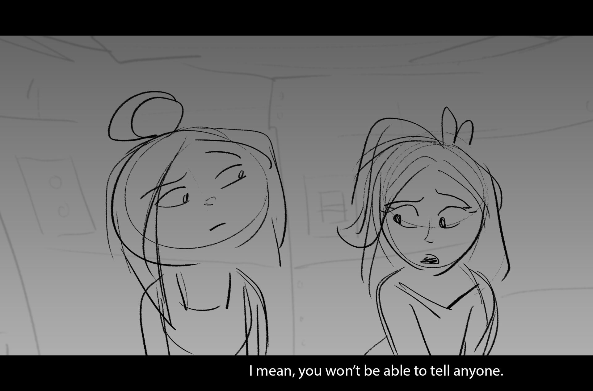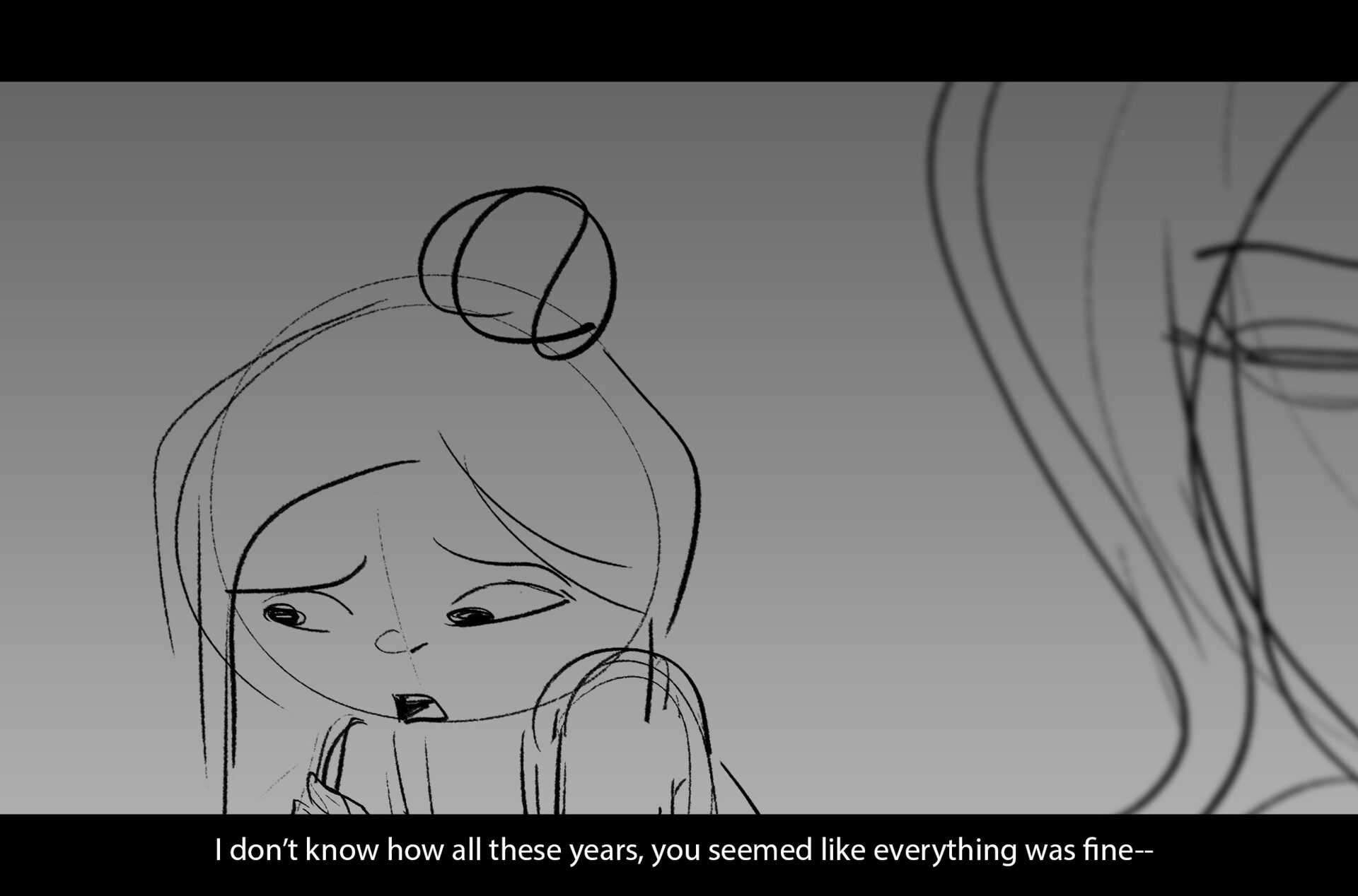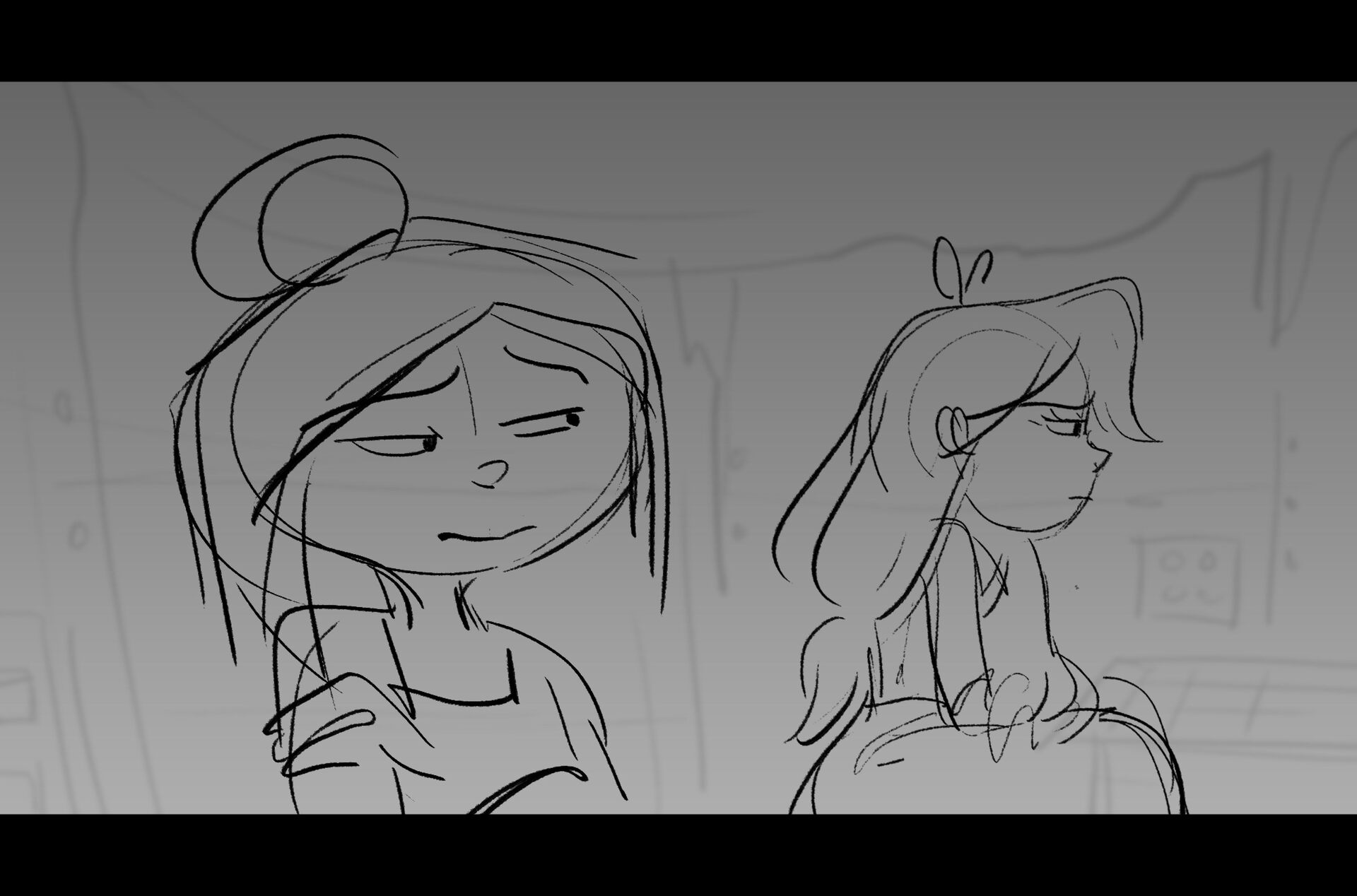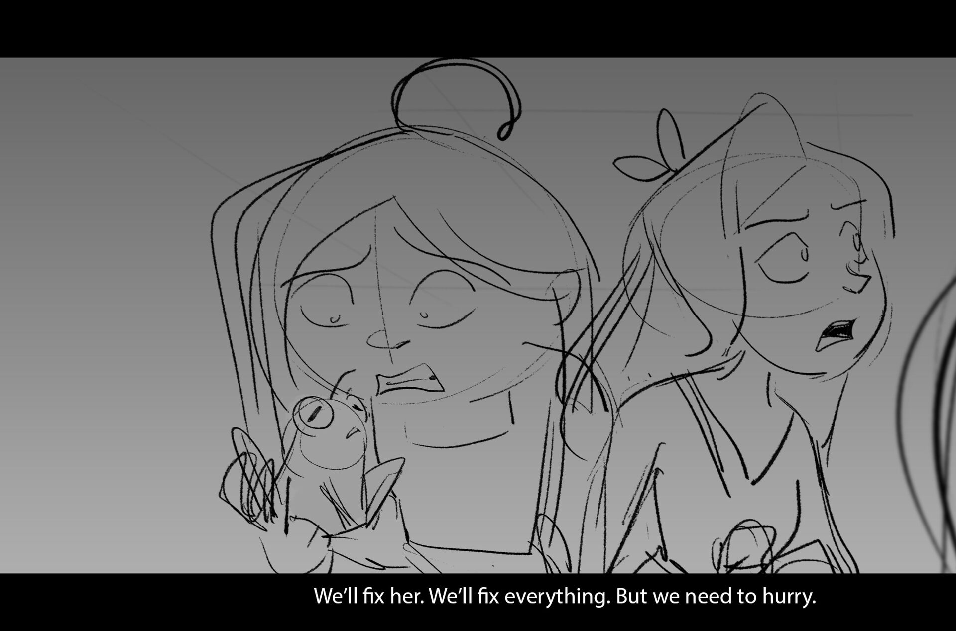 Drama/acting: A sequence I storyboarded from script pages. Because this scene is preceded by a big action scene with an intense fight between Lilith and Cinderella, I really wanted to slow things down and keep the camera simple for this first moment of real, sincere bonding between the sisters. Property of Netflix Animation Studios, 2024.