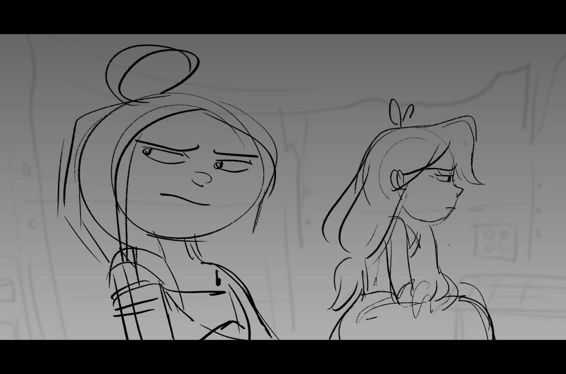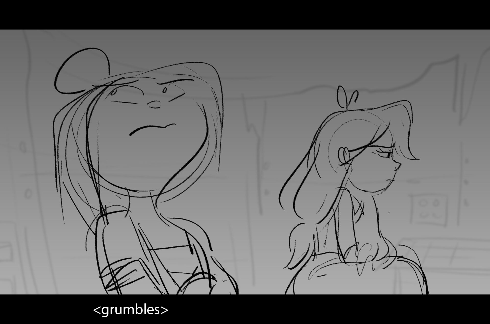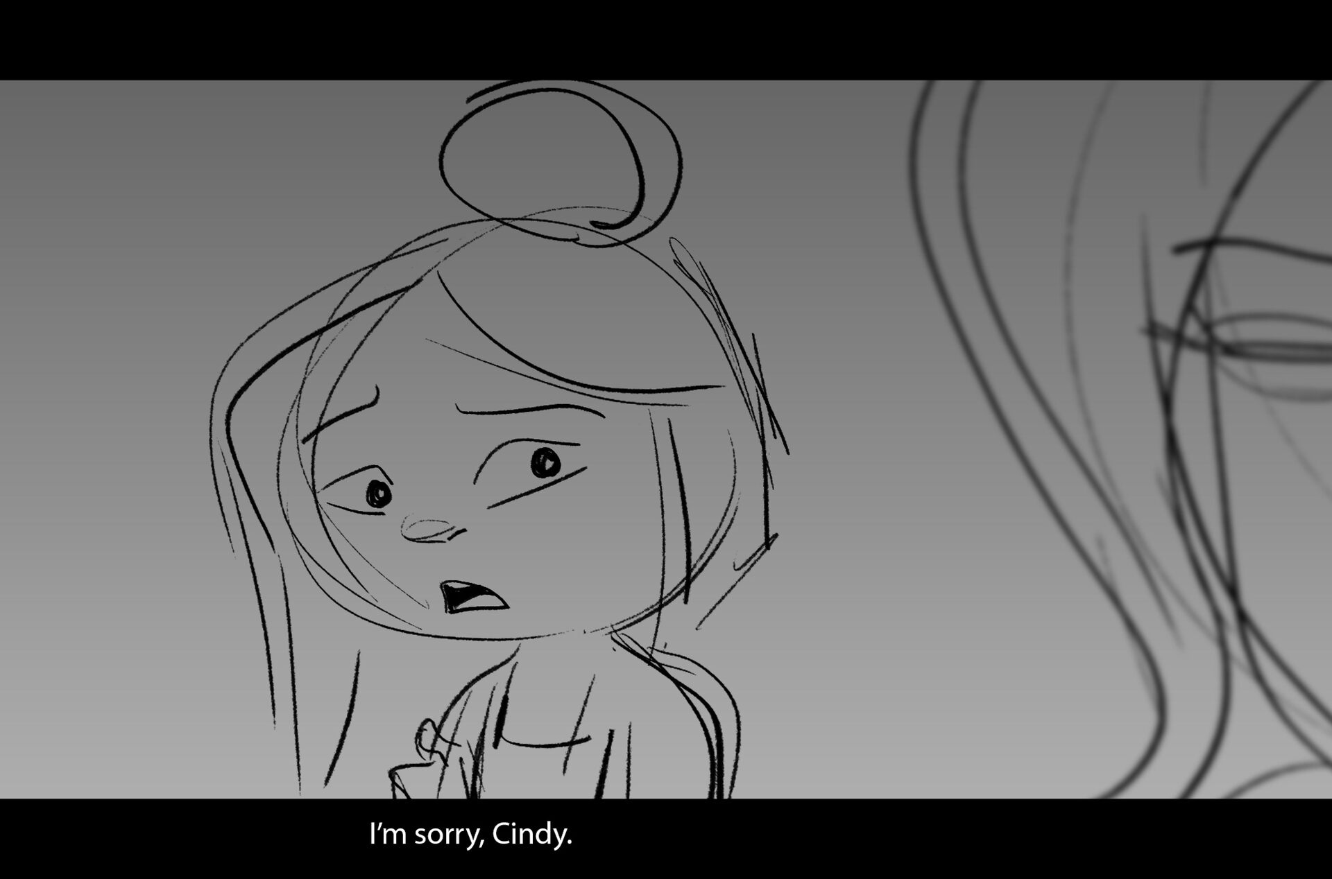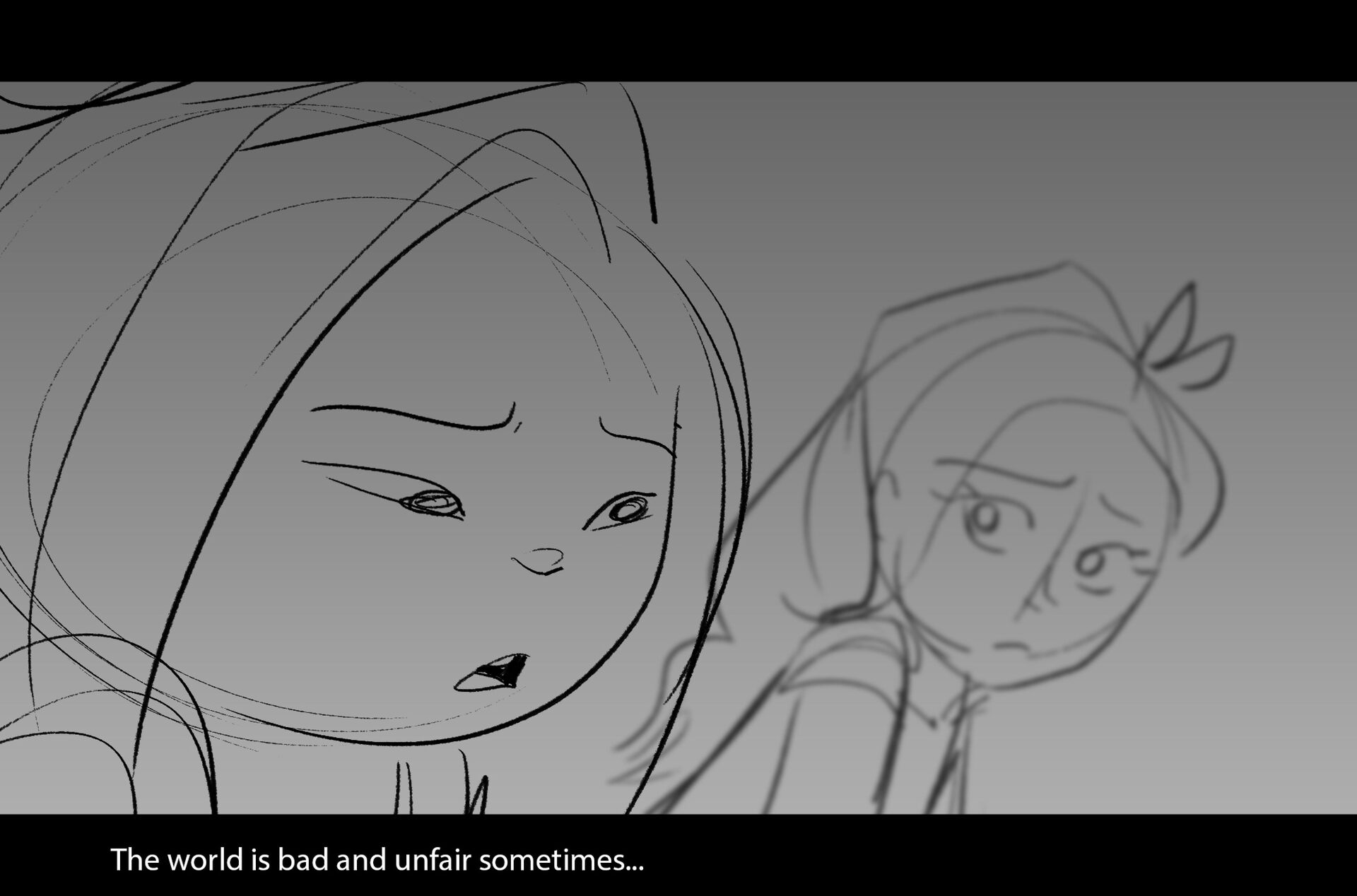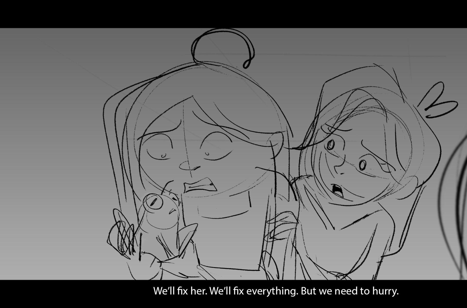 Drama/acting: A sequence I storyboarded from script pages. Because this scene is preceded by a big action scene with an intense fight between Lilith and Cinderella, I really wanted to slow things down and keep the camera simple for this first moment of real, sincere bonding between the sisters. Property of Netflix Animation Studios, 2024.