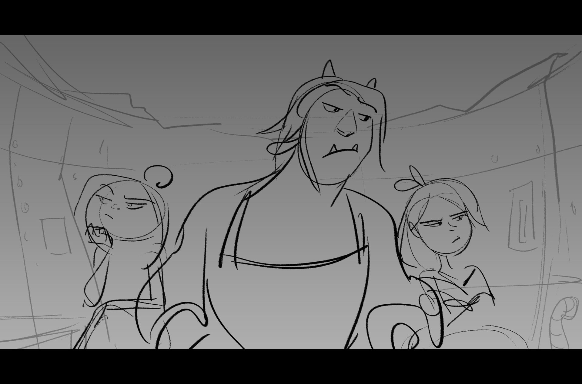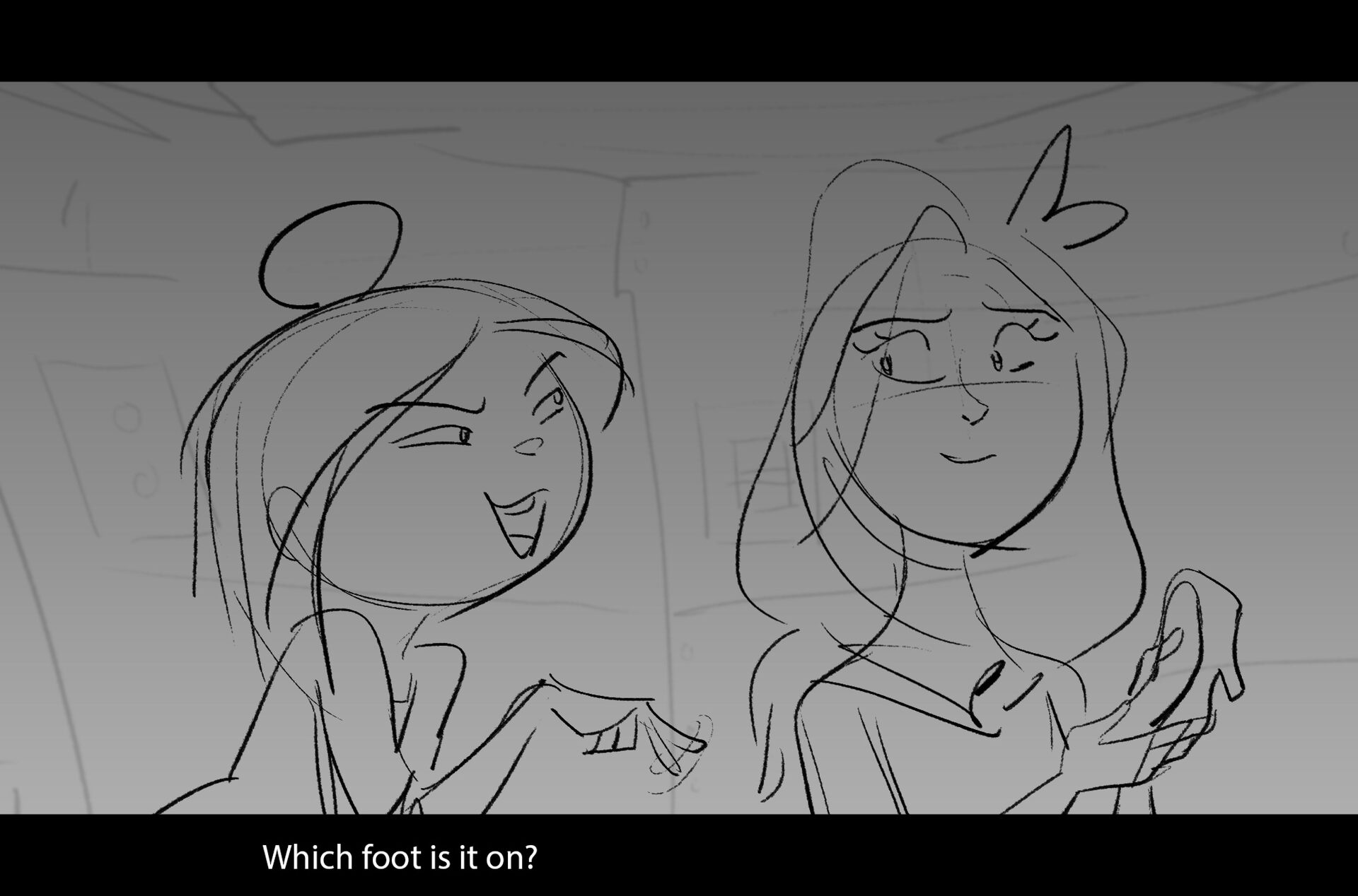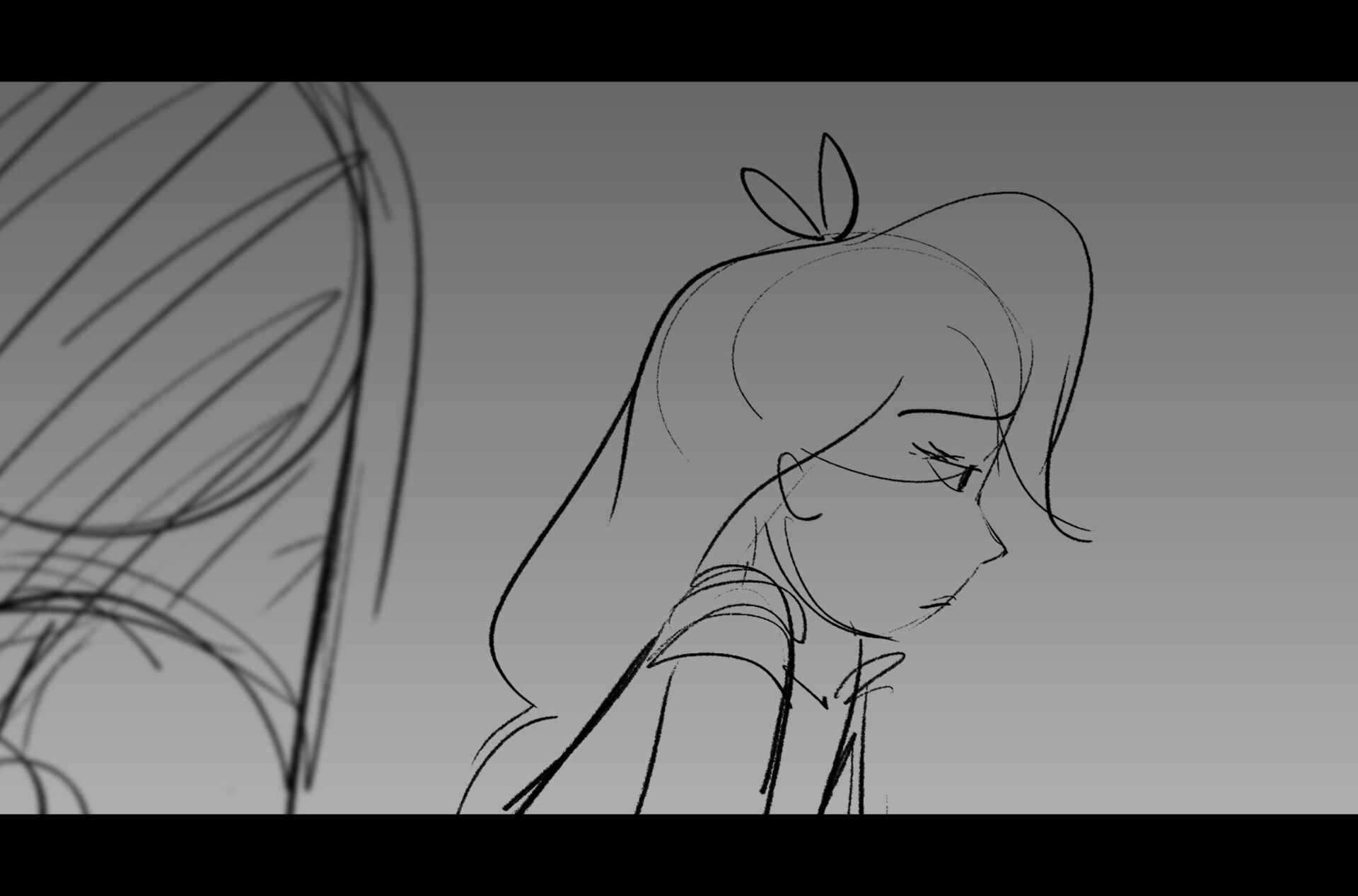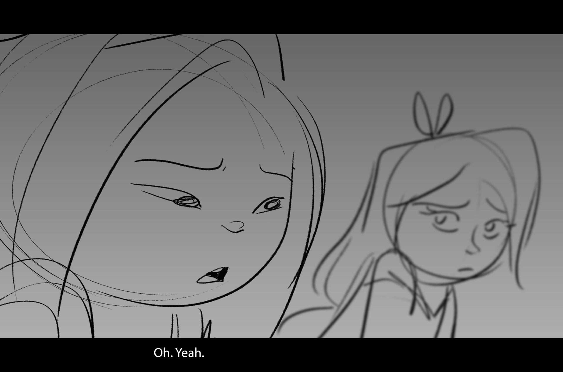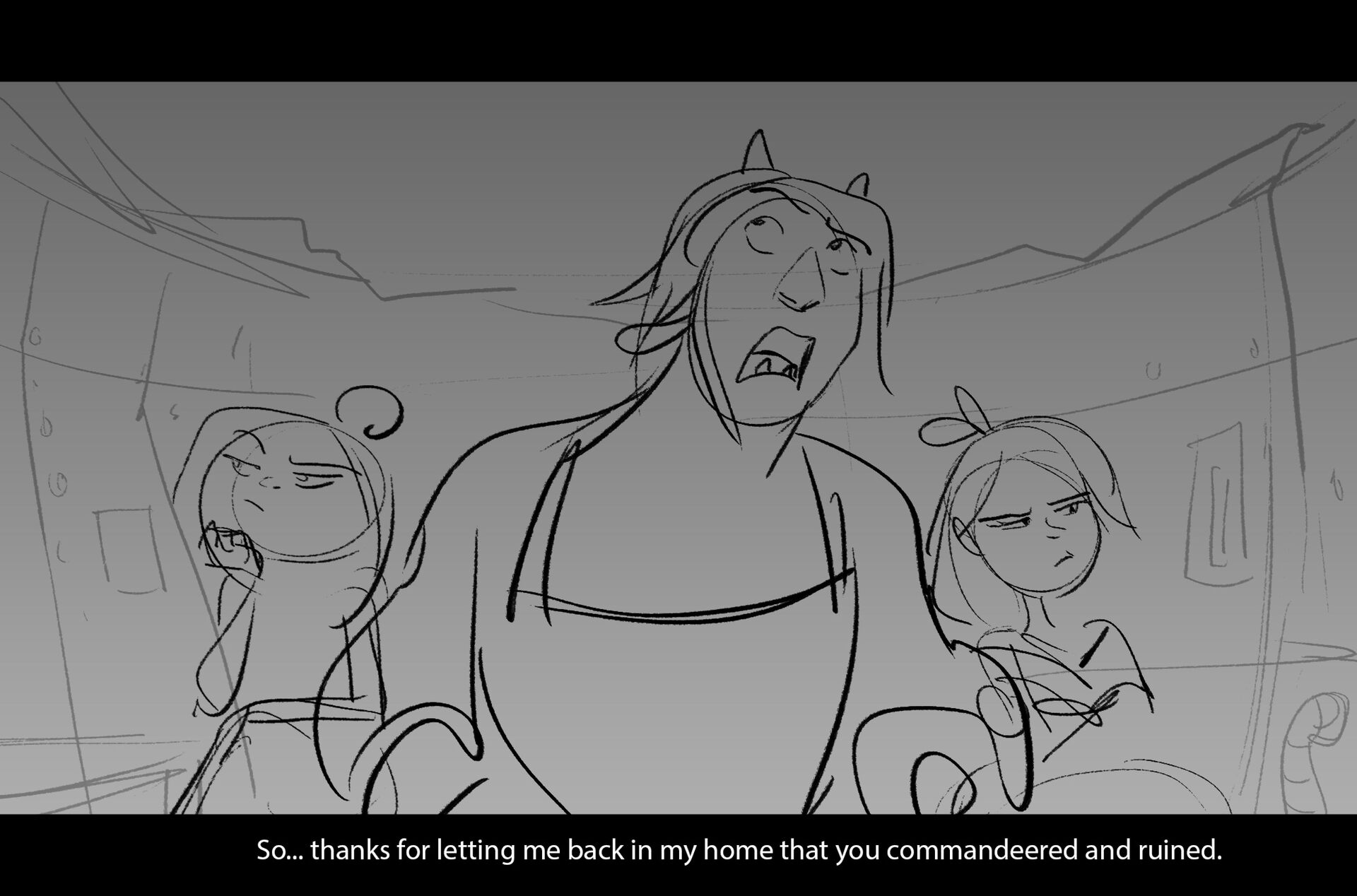 Drama/acting: A sequence I storyboarded from script pages. Because this scene is preceded by a big action scene with an intense fight between Lilith and Cinderella, I really wanted to slow things down and keep the camera simple for this first moment of real, sincere bonding between the sisters. Property of Netflix Animation Studios, 2024.