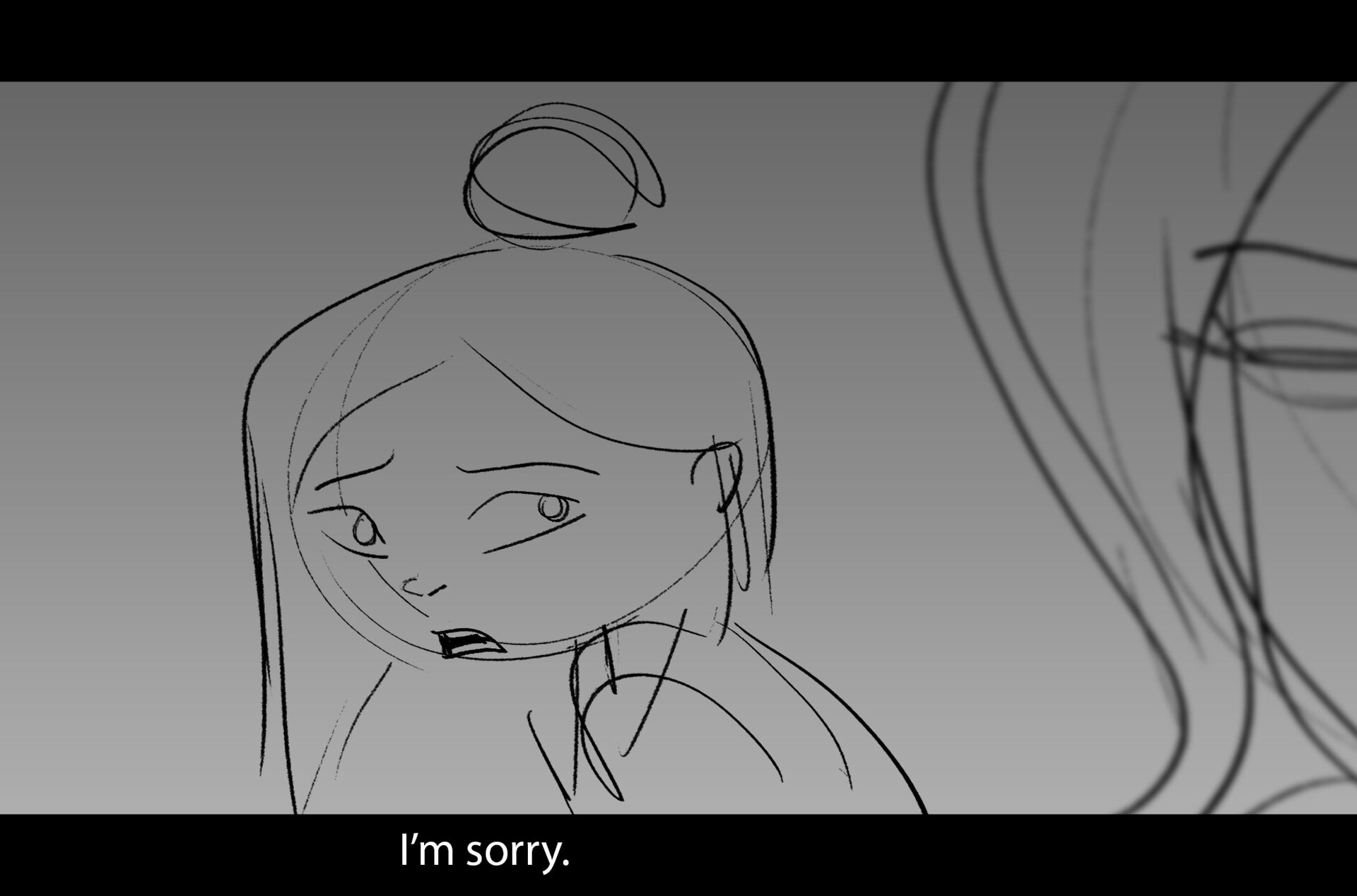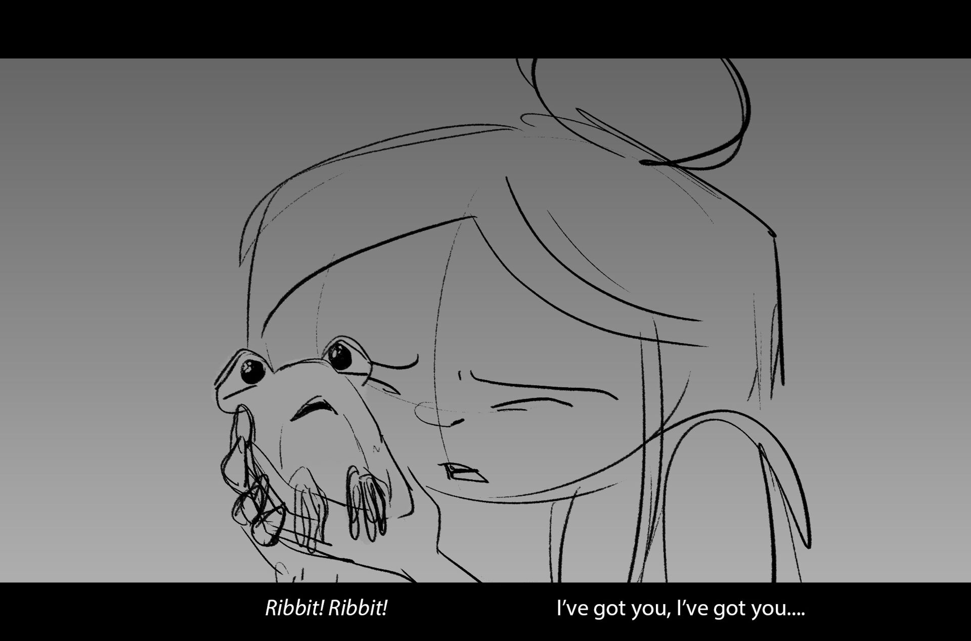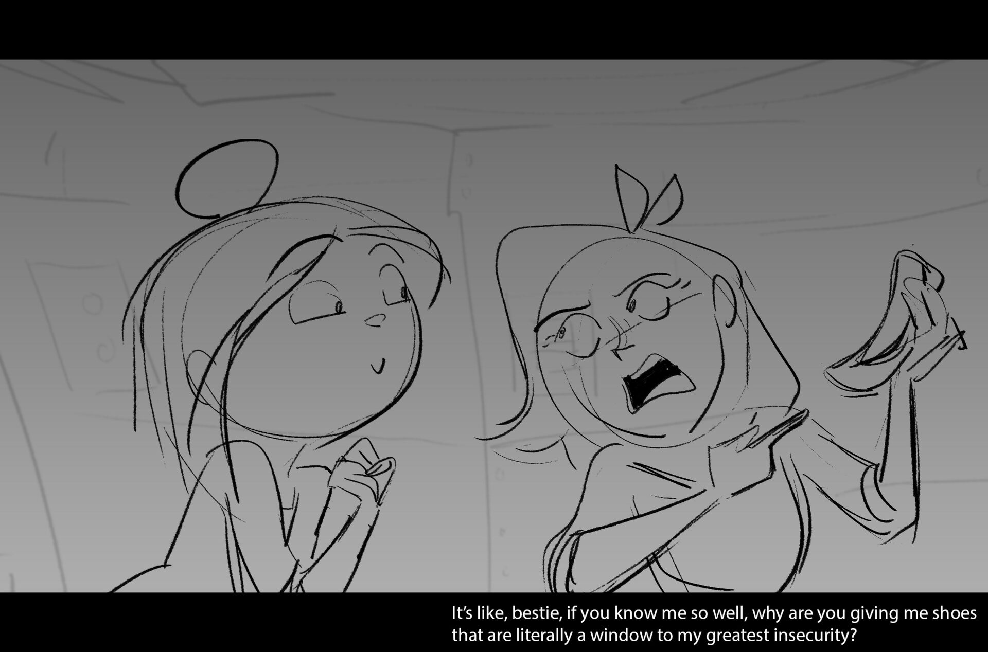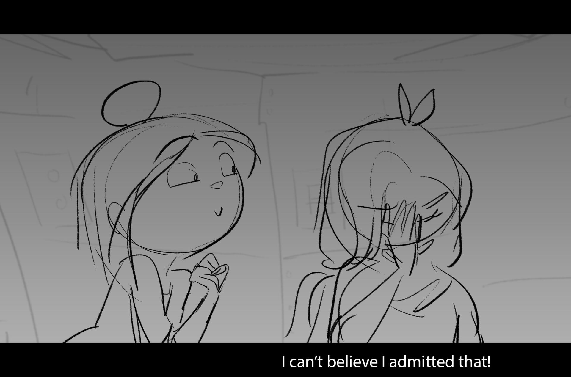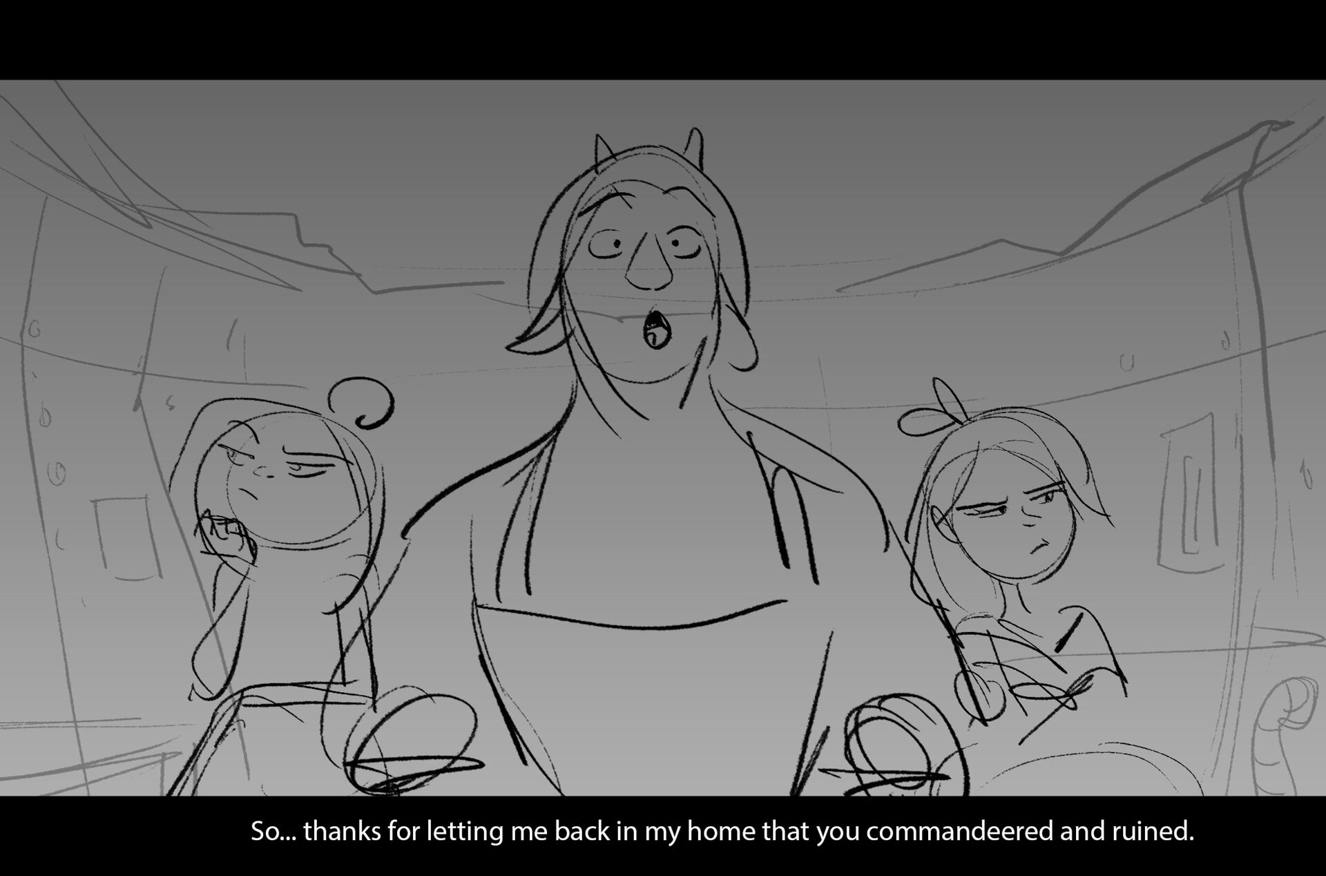 Drama/acting: A sequence I storyboarded from script pages. Because this scene is preceded by a big action scene with an intense fight between Lilith and Cinderella, I really wanted to slow things down and keep the camera simple for this first moment of real, sincere bonding between the sisters. Property of Netflix Animation Studios, 2024.