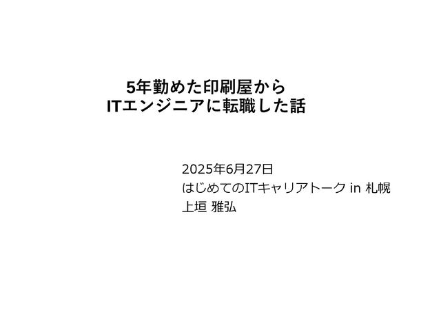 5年勤めた印刷屋から ITエンジニアに転職した話 2025年6月27日 はじめてのITキャリアトーク in 札幌 上垣 雅弘