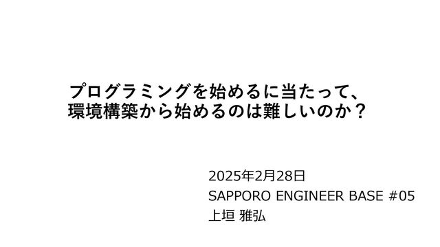 プログラミングを始めるに当たって、 環境構築から始めるのは難しいのか? 2025年2月28日 SAPPORO ENGINEER BASE #05 上垣 雅弘