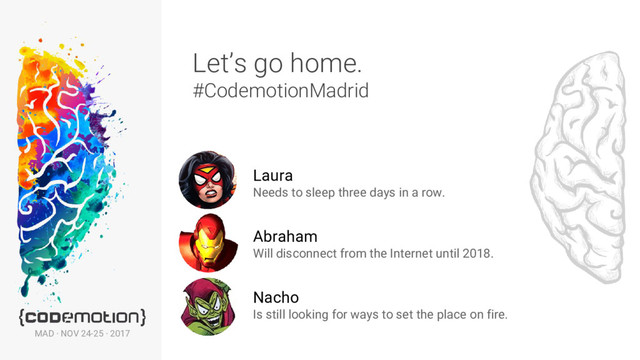Morillo GDG organizer, collaborator at AgileGirls and Tech&Ladies, Mentor at Tech Shessions. Laura Lacarra Organizer at Cachirulo Valley and WTM Zaragoza, former contributor at Betabeers and Agile Aragón Jerónimo López Former CTO at Otogami. Co-organizer at MadridJUG, Java addict, JavaScript troll. Joaquín Engelmo “Kini” Gate Guardian of Good Practices at Tuenti Javier Abadía Lead Developer en StyleSage, Big Data for Fashion Xaviju Julián Co-organizer at Open Source Design Madrid. Front-end developer at Kaleidos and Taiga.