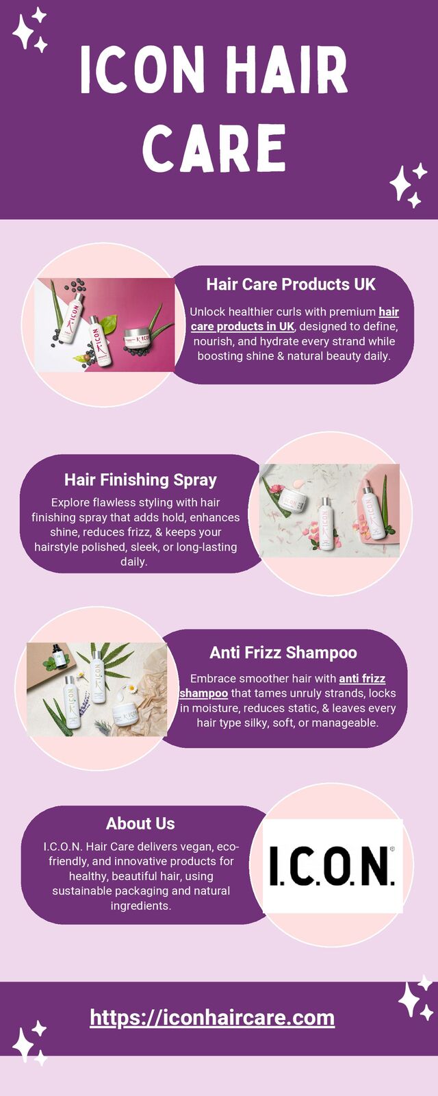 products in UK, designed to define, nourish, and hydrate every strand while boosting shine & natural beauty daily. Hair Care Products UK Hair Finishing Spray Explore flawless styling with hair finishing spray that adds hold, enhances shine, reduces frizz, & keeps your hairstyle polished, sleek, or long-lasting daily. Anti Frizz Shampoo Embrace smoother hair with anti frizz shampoo that tames unruly strands, locks in moisture, reduces static, & leaves every hair type silky, soft, or manageable. About Us I.C.O.N. Hair Care delivers vegan, eco- friendly, and innovative products for healthy, beautiful hair, using sustainable packaging and natural ingredients. https://iconhaircare.com