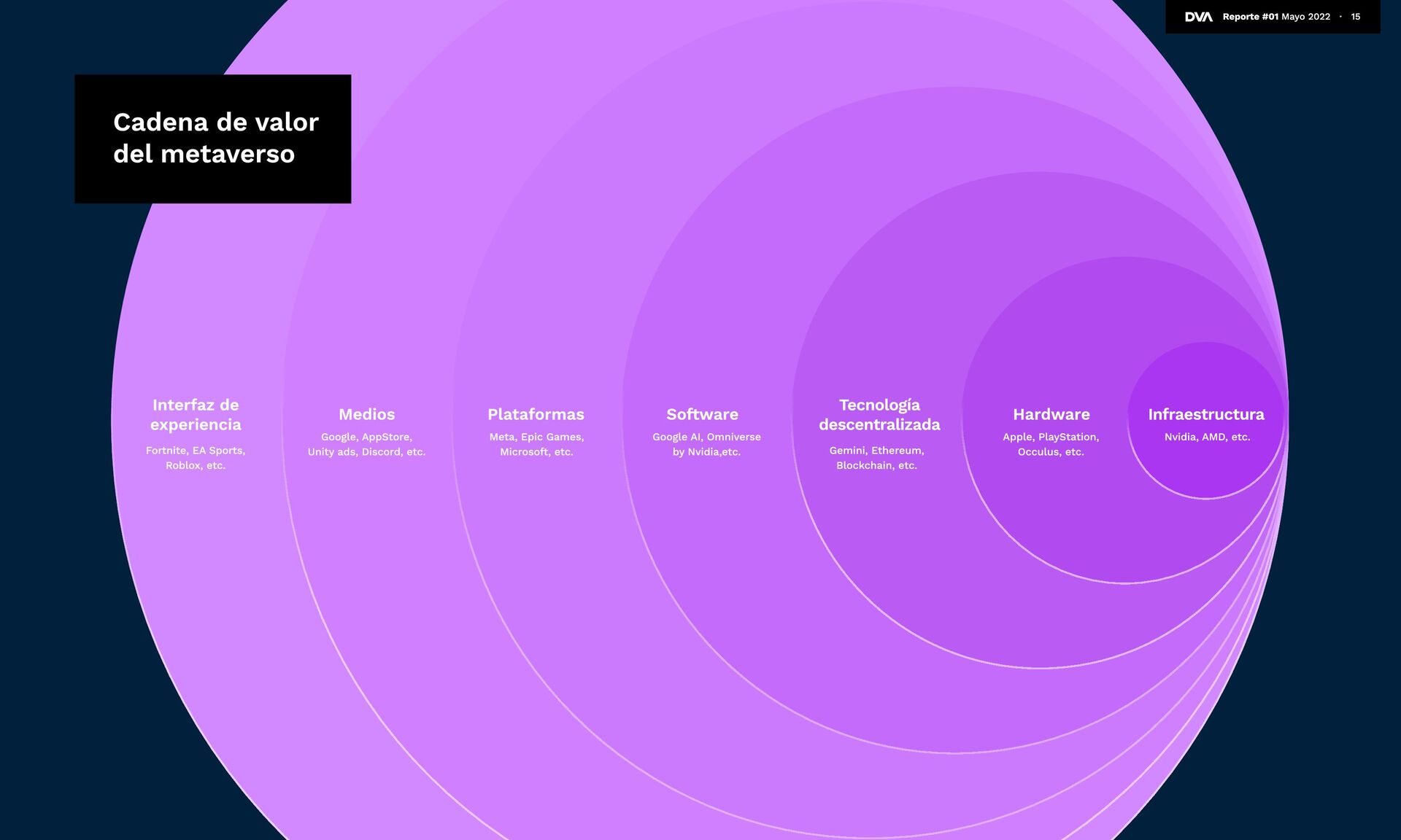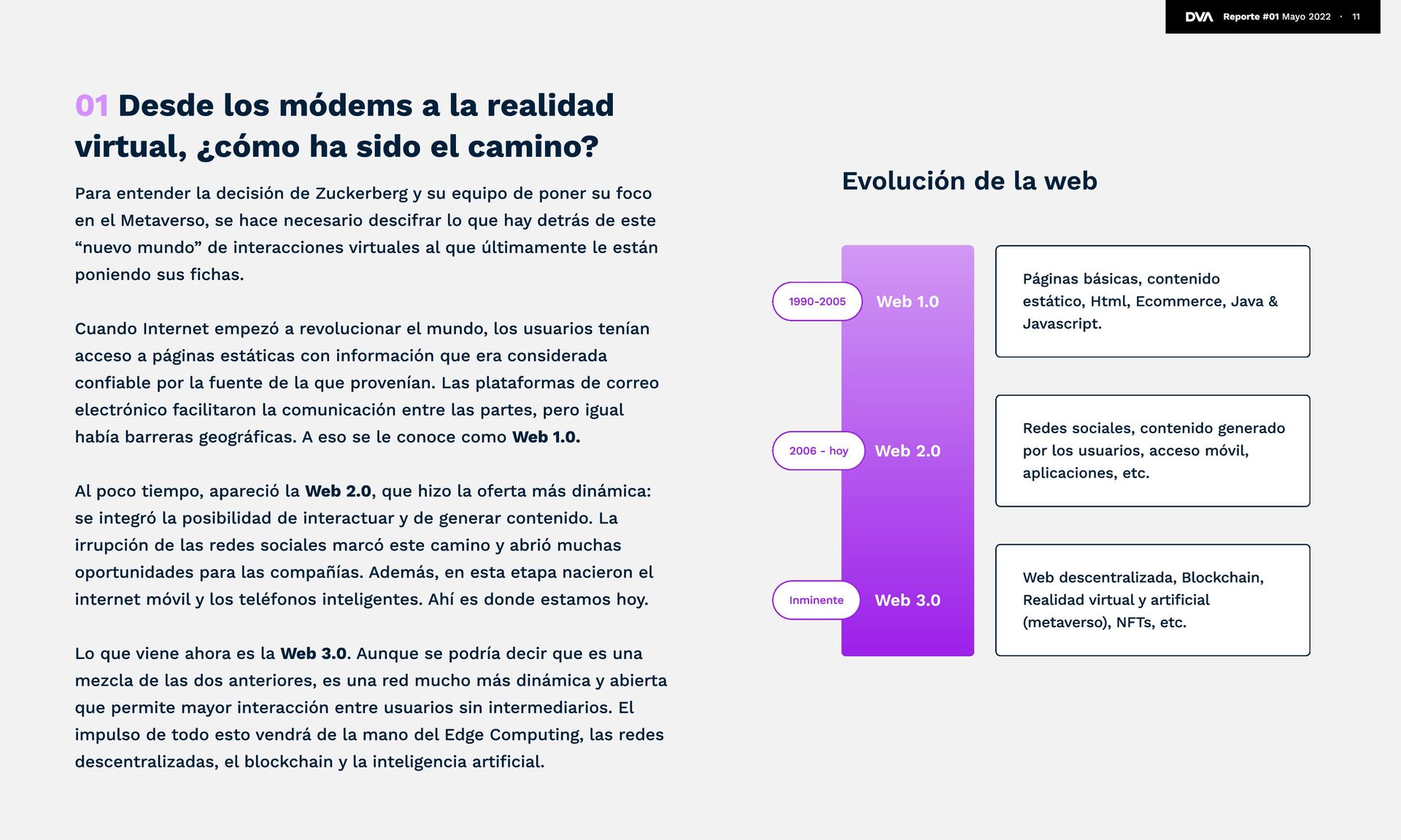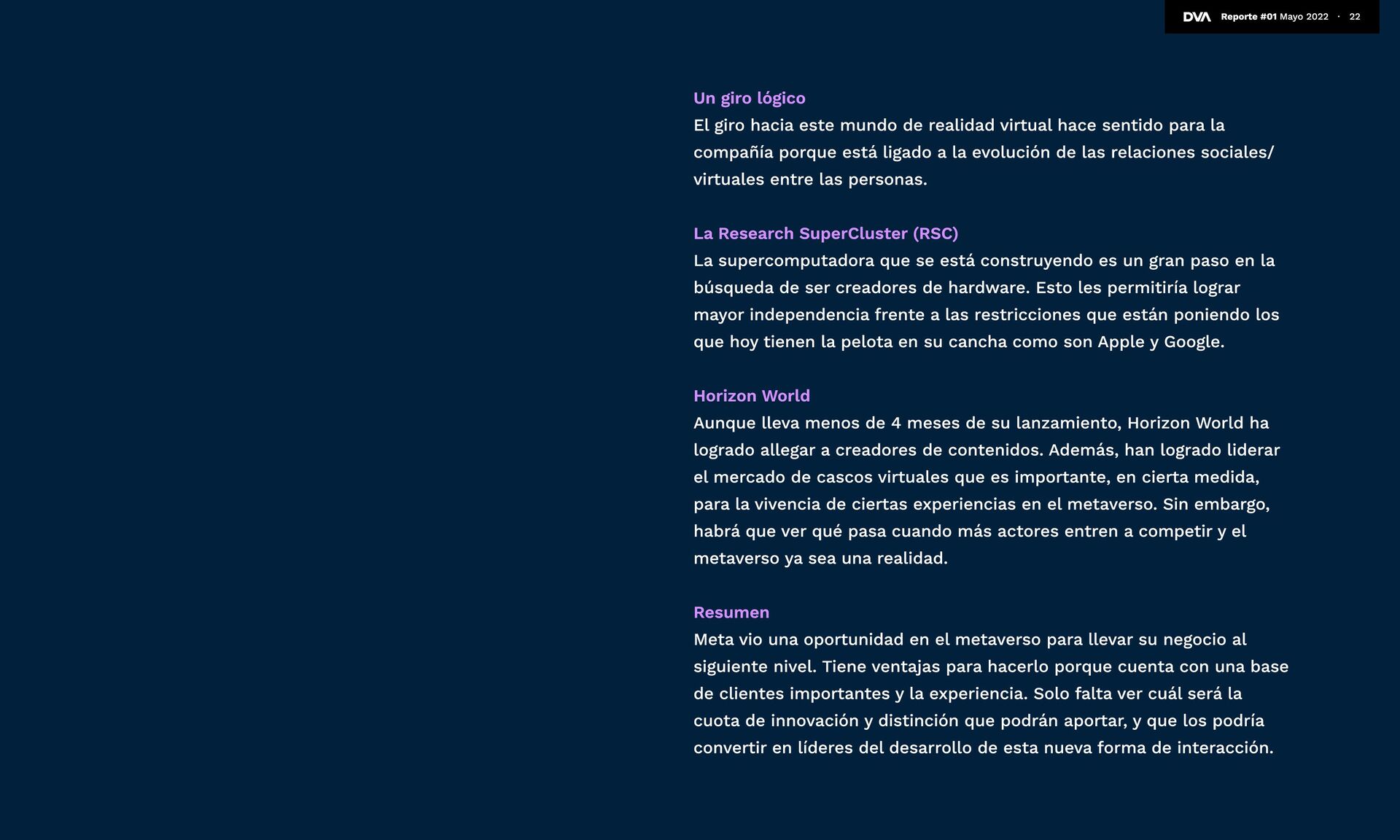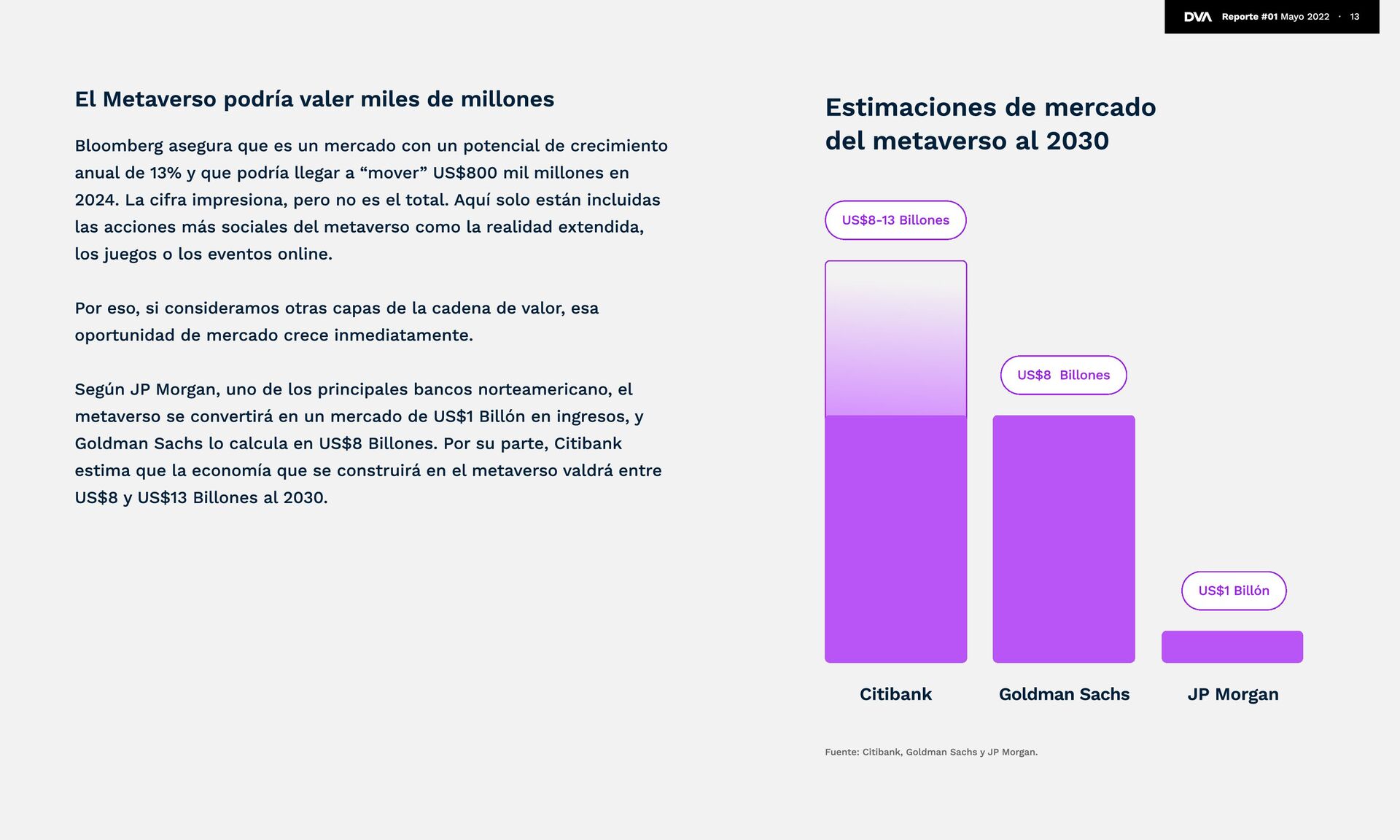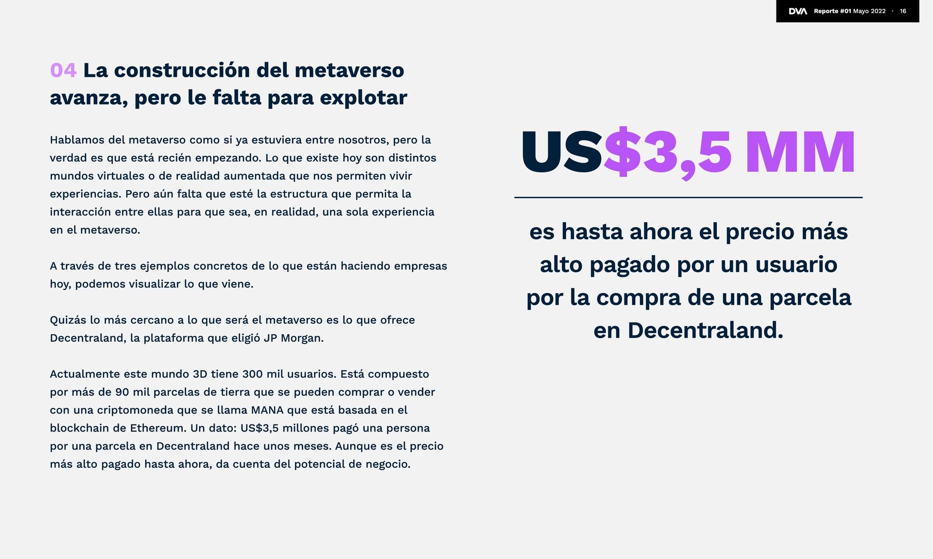 Zuckerberg lo tiene clarísimo, hay usuarios que aún lo están digiriendo y otros que simplemente no saben qué es el metaverso. De hecho, una encuesta realizada en nueve mercados reveló que actualmente el concepto está lejos de ser de público conocimiento. Etimológicamente, “metaverso” viene de la idea de trascender el universo. En una encuesta de Statista a adultos norteamericanos, un 42% lo define como un mundo virtual generado por computadoras donde las personas pueden sociabilizar, jugar y trabajar. La definición se acerca bastante a la realidad, pero le falta un poco para llegar al 100%. El metaverso se define como la convergencia de la realidad física, aumentada y virtual en un espacio compartido. Es más, si vamos al detalle, podemos decir que el metaverso debe ser persistente (que exista contantemente), sincrónico y en vivo, debe tener una economía funcional, ser interoperable, y creado por muchos. ¿Has escuchado sobre el Metaverso? Estudio Investigación realizada en 12.947 usuarios de internet de entre 16-64 años, en 9 diferentes mercados (Brasil, China, Francia, Alemania, India,Italia, Japón, Inglaterra y EEUU). Sé lo que es 33% No lo conozco 30% Sé que existe pero no sé lo que es 37% 12 Reporte #01 Mayo 2022 ∙ “En ese futuro podrás teletransportarte instantáneamente como un holograma para estar en la oficina sin tener que desplazarte, en un concierto con amigos o en la sala de tus padres para ponerte al día. ” Mark Zuckerberg
