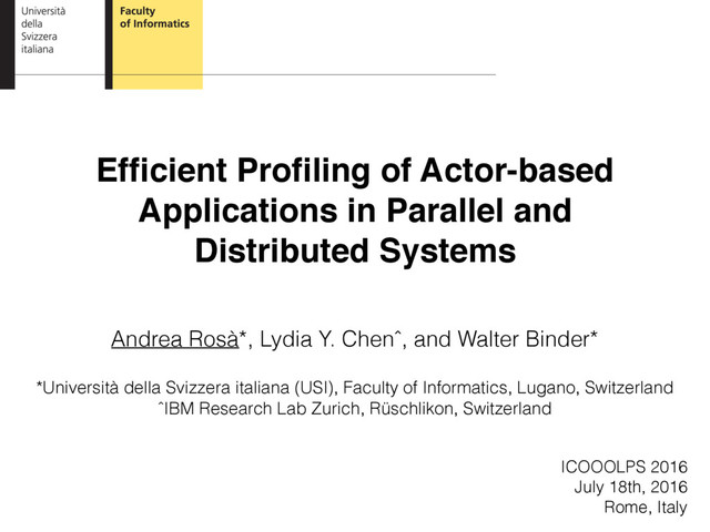 actors • Exception: Akka [2, 3, 4, 5, 6] - Little focus on utilization/communication - Typical focus: mailbox size, time in mailbox, errors, dispatchers, … • Not actor-centric profilers are little applicable to actors - Several profilers focus mainly on threads - Communication profilers focus mainly on the network stack Related work [2] Lightbend Monitoring. https://www.lightbend.com/products/monitoring.
