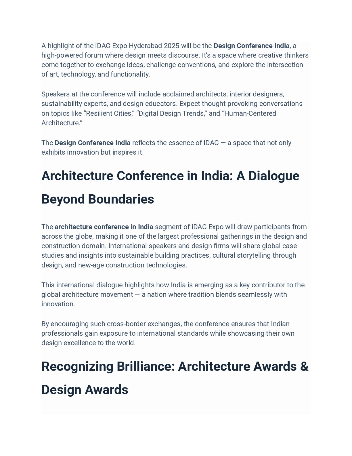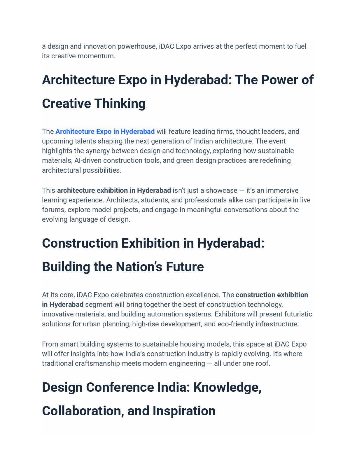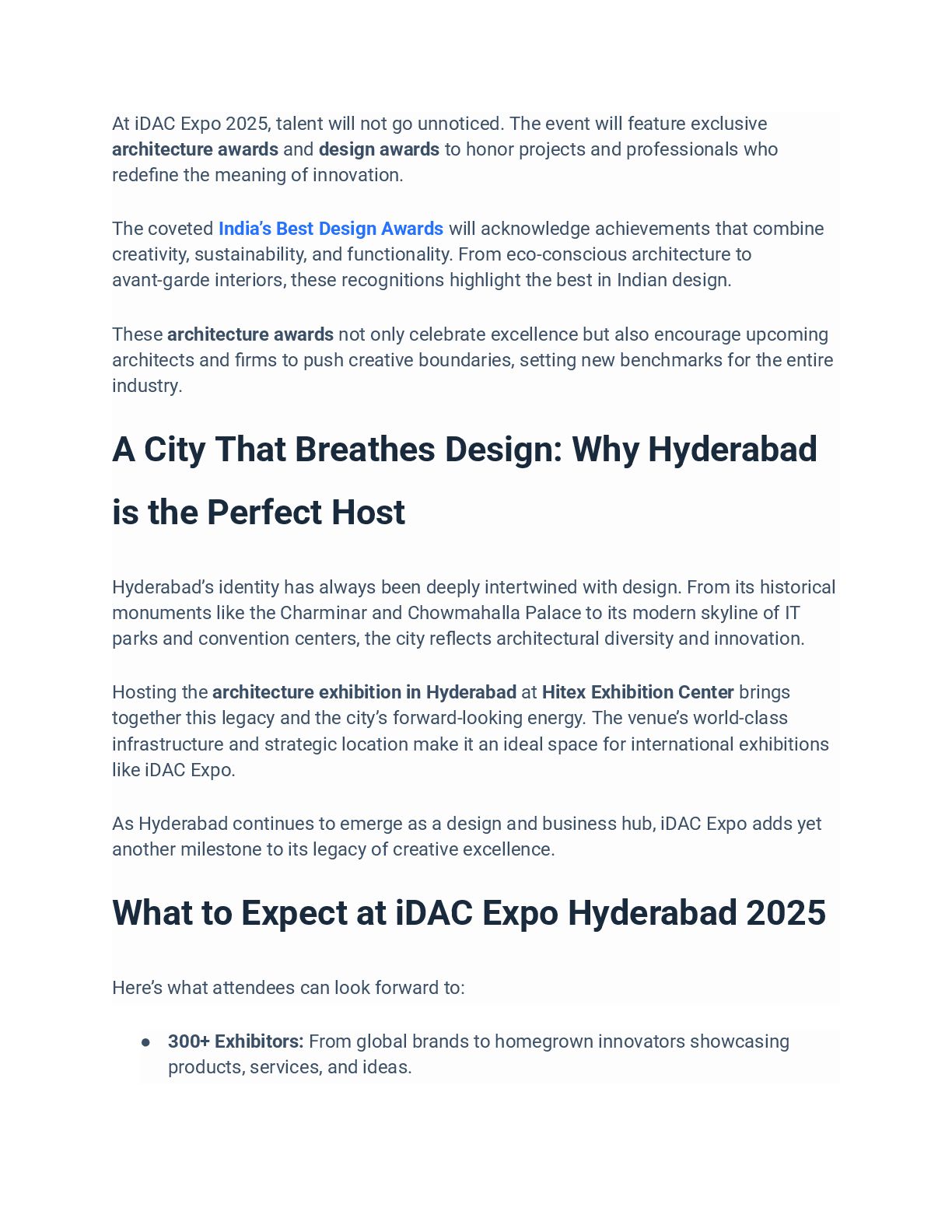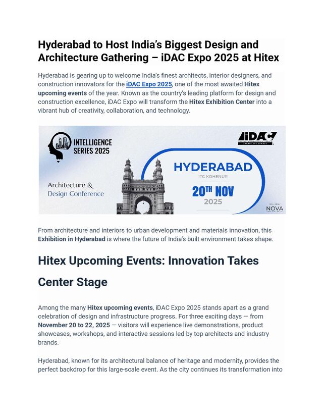 Join iDAC Expo 2025 at Hitex, Hyderabad — India’s biggest design and architecture gathering from November 20–22, 2025. Experience the best in architecture, interiors, and construction innovation at this leading Architecture Expo in Hyderabad, hosted by idac-expo. Explore exhibitions, conferences, and design awards celebrating creativity and sustainable innovation.