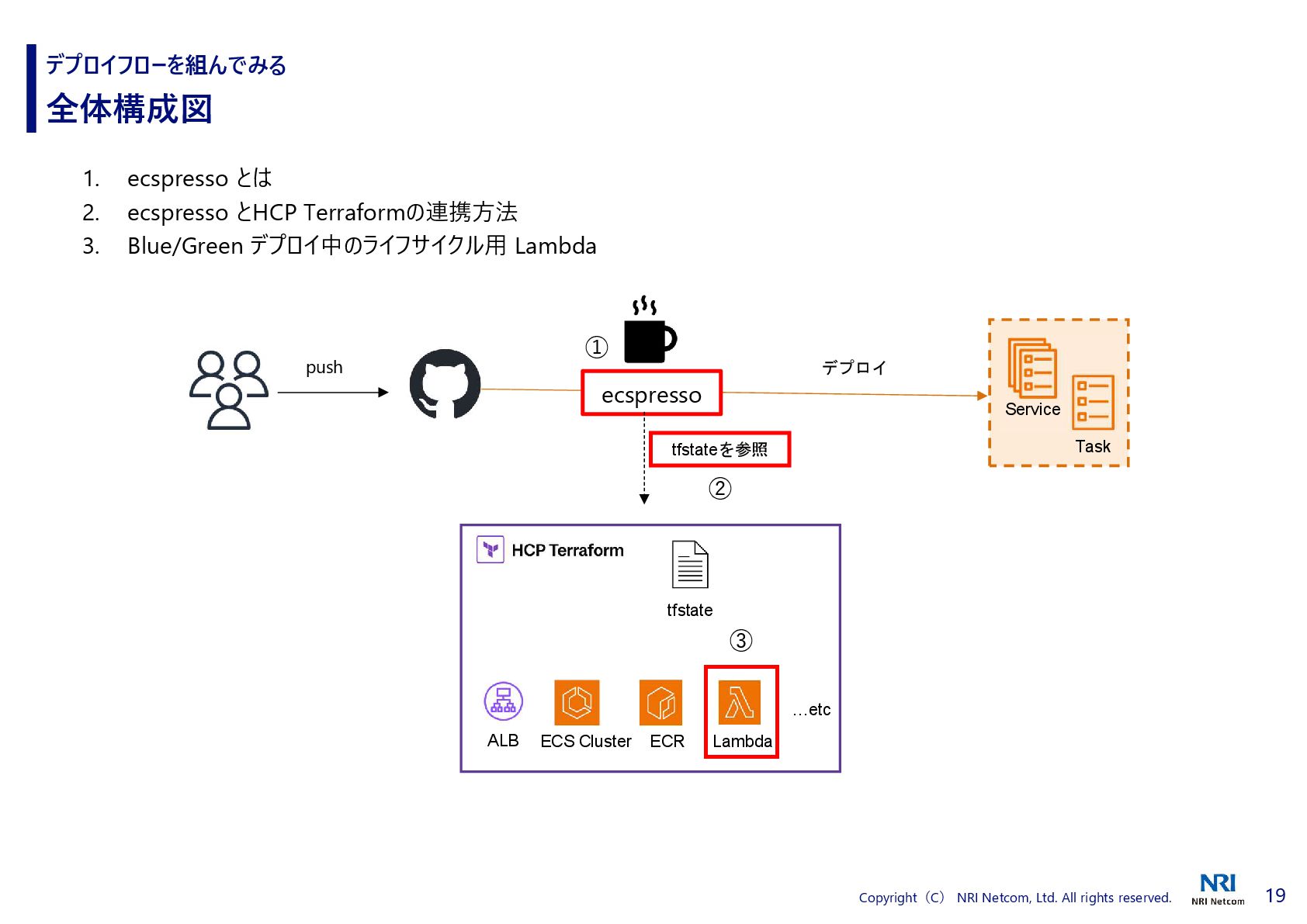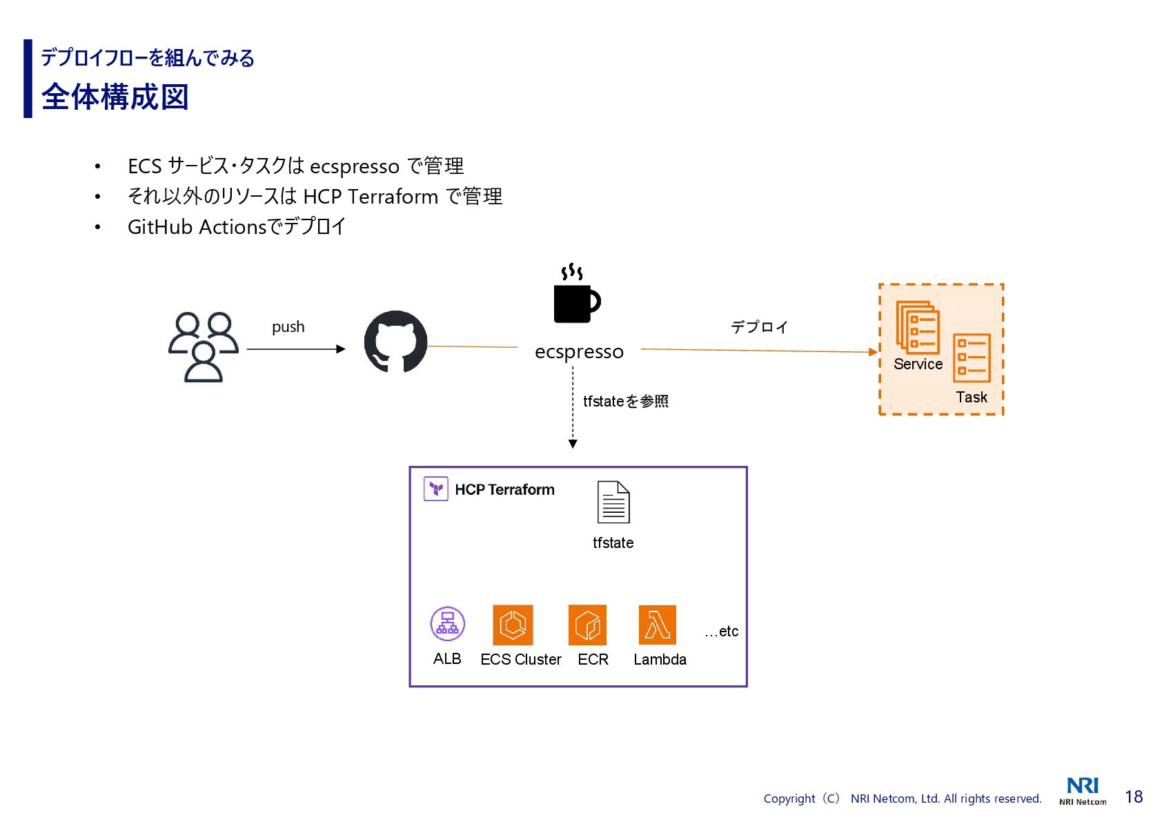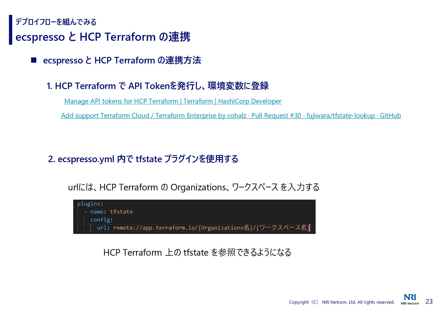 HCP Terraform の連携 デプロイフローを組んでみる ecspresso と HCP Terraform の連携方法 2. ecspresso.yml 内で tfstate プラグインを使用する 1. HCP Terraform で API Tokenを発行し、環境変数に登録 Manage API tokens for HCP Terraform | Terraform | HashiCorp Developer Add support Terraform Cloud / Terraform Enterprise by cohalz · Pull Request #30 · fujiwara/tfstate-lookup · GitHub HCP Terraform 上の tfstate を参照できるようになる urlには、HCP Terraform の Organizations、ワークスペース を入力する