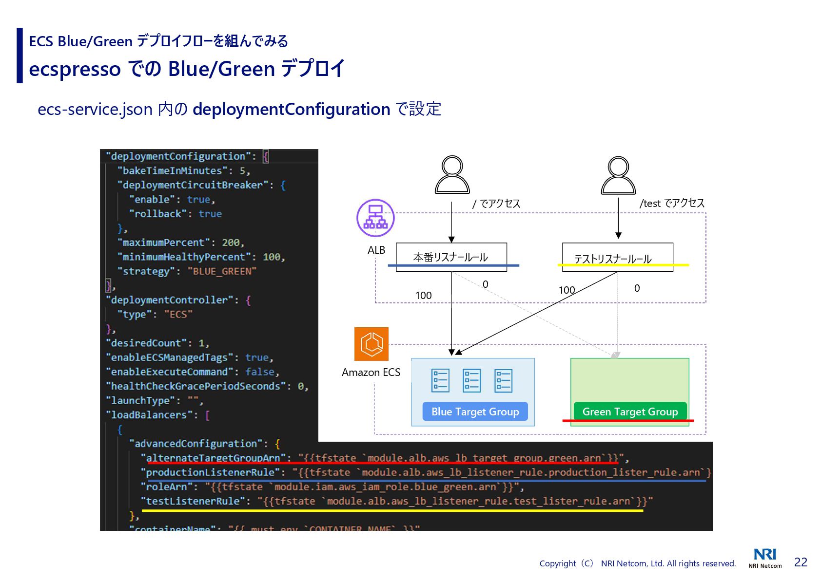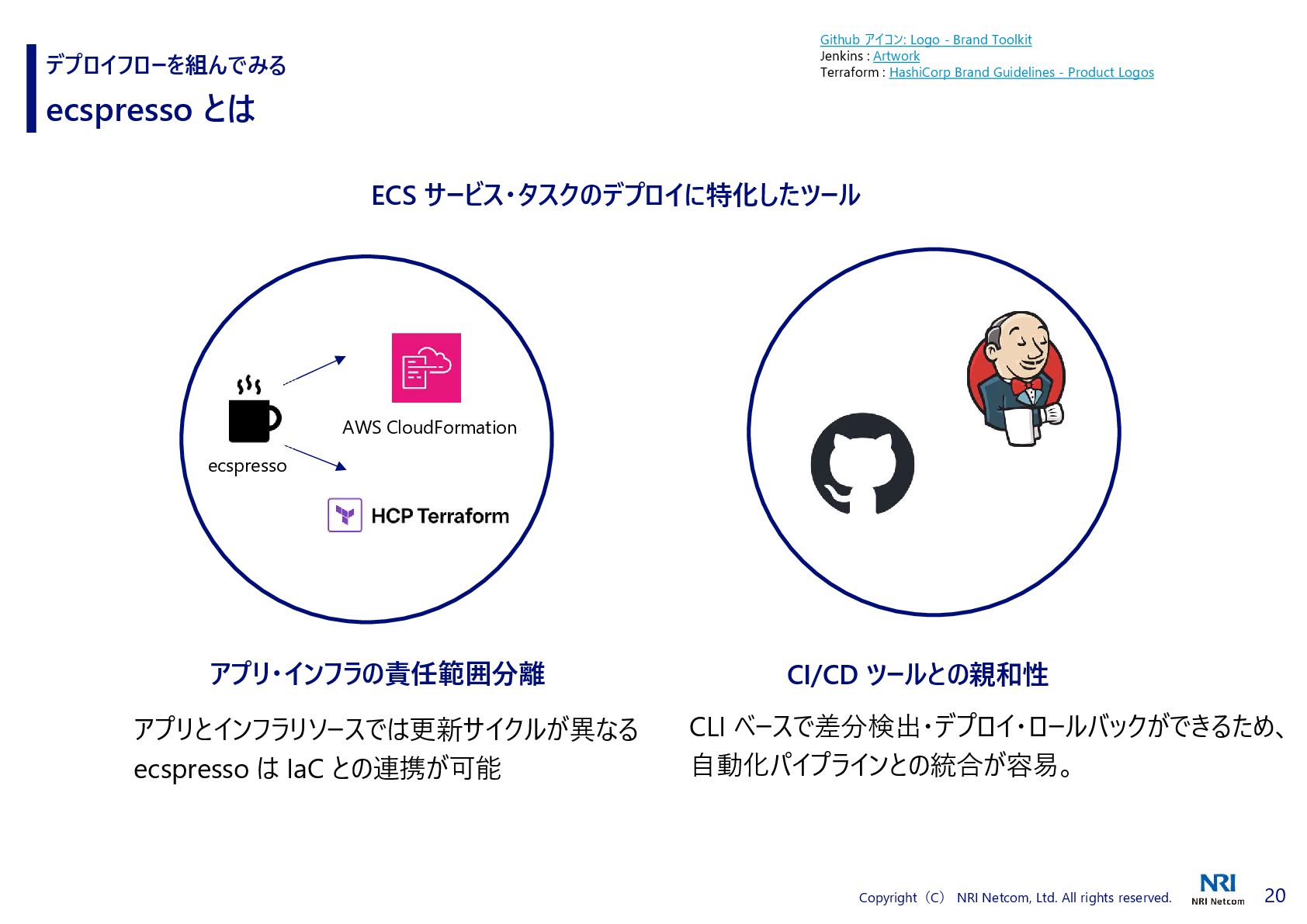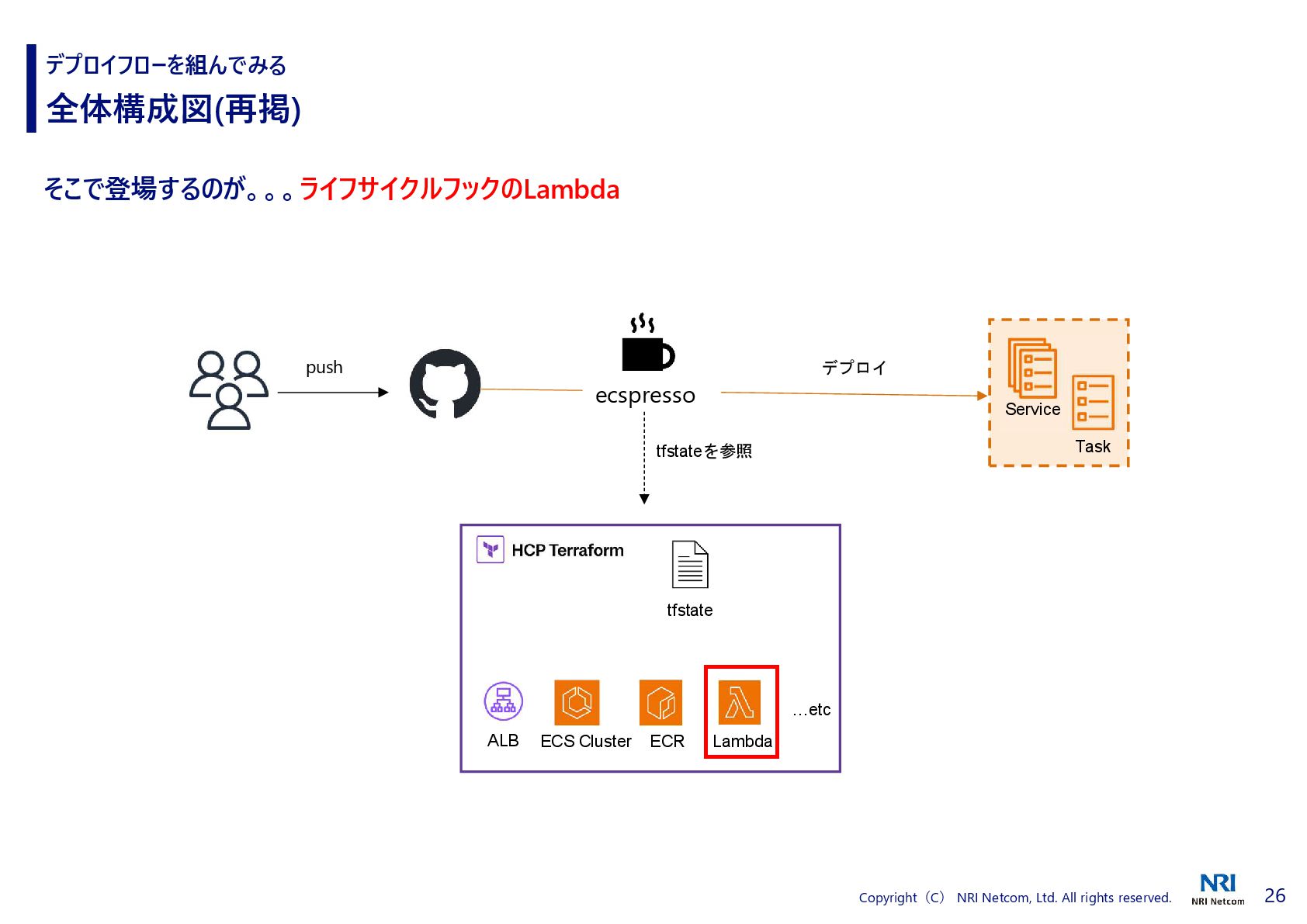 HCP Terraform の連携 デプロイフローを組んでみる ecspresso と HCP Terraform の連携方法 2. ecspresso.yml 内で tfstate プラグインを使用する 1. HCP Terraform で API Tokenを発行し、環境変数に登録 Manage API tokens for HCP Terraform | Terraform | HashiCorp Developer Add support Terraform Cloud / Terraform Enterprise by cohalz · Pull Request #30 · fujiwara/tfstate-lookup · GitHub HCP Terraform 上の tfstate を参照できるようになる urlには、HCP Terraform の Organizations、ワークスペース を入力する
